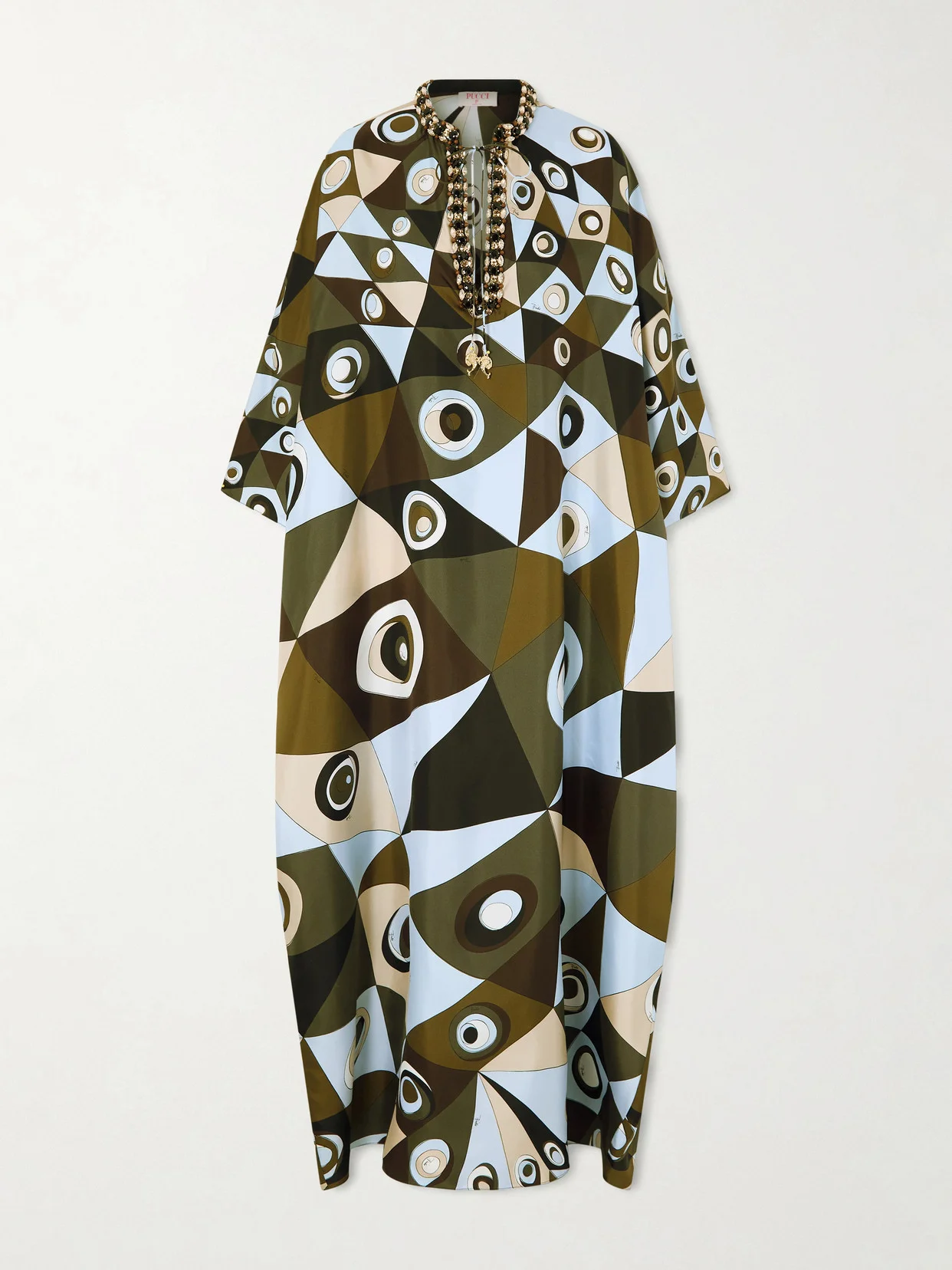 Emilio Pucci showcases its signature kaleidoscopic prints and Italian elegance in this kaftan. Cut from fluid silk-twill in the 'Occhi' print, it has a loose fit with wide sleeves that move gracefully with the body. The piece is finished with intricate embroidery of stones, wooden elements, and sequins that catch the light beautifully.