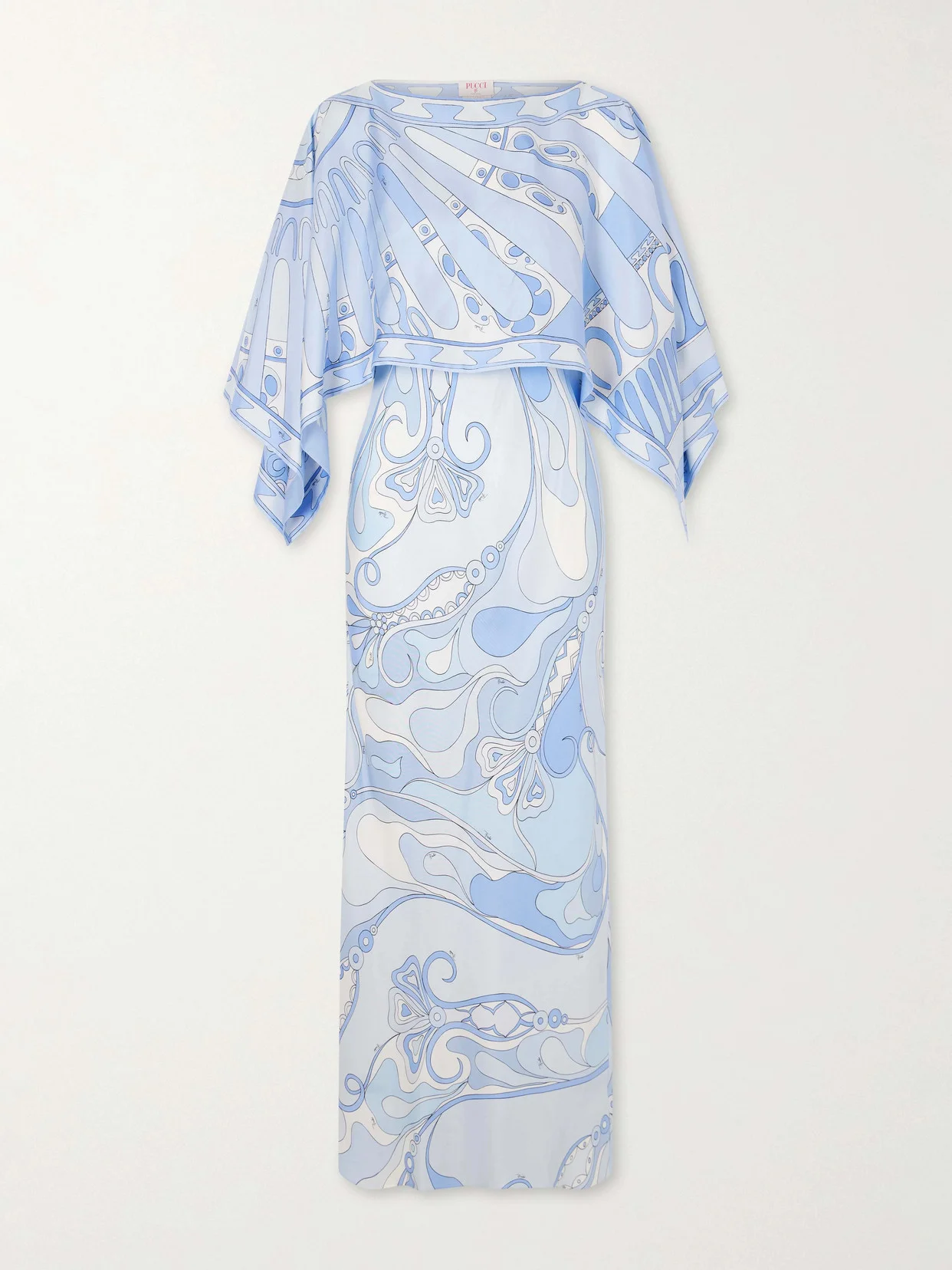 PUCCI's signature swirling pattern makes this dress instantly recognizable. Crafted from fluid silk-twill, it features an overlay that creates a flowing cape effect and kimono-style sleeves. Pair with statement earrings and mules for an effortlessly elegant look.