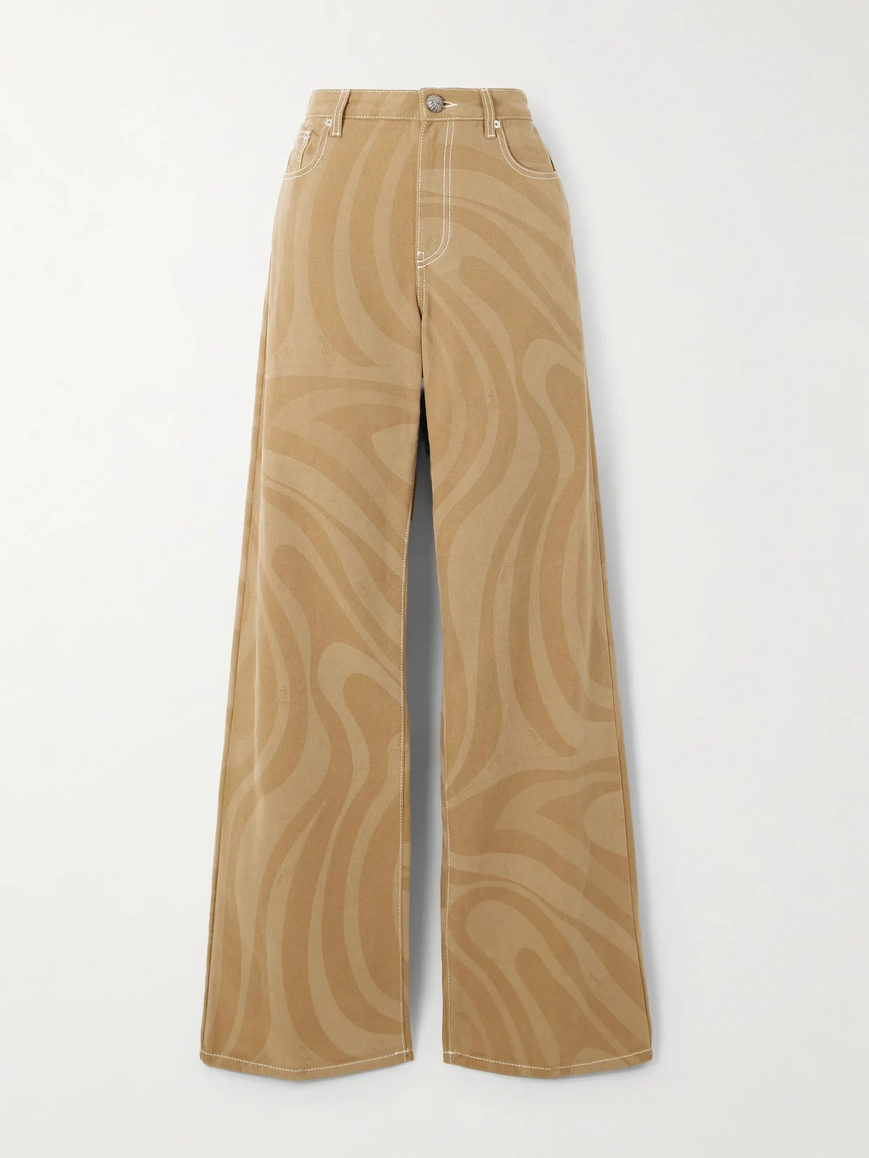PUCCI's pants are patterned with a neutral version of the label's signature 'Marmo' swirls. They're made from tactile cotton-cavas and have a high waist and loose, wide-legs. The seashell-shaped button matches those on the coordinating jacket in our edit.