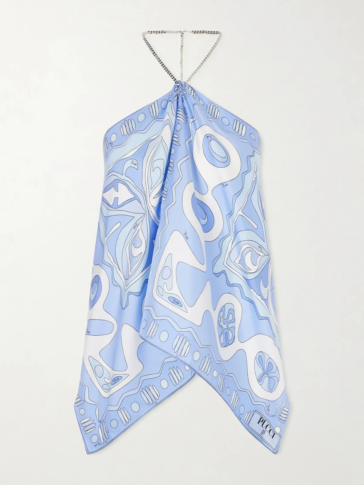 Pucci's designs are bold, fluid, and unmistakably glamorous, as seen in this top. Cut from silk-twill in an abstract print, it features chain straps that fasten into a halterneck, adding a jewel-like touch. The fabric drapes into a scarf-like shape with soft pleats and asymmetrical hems, making it versatile enough for both casual and dressier occasions.