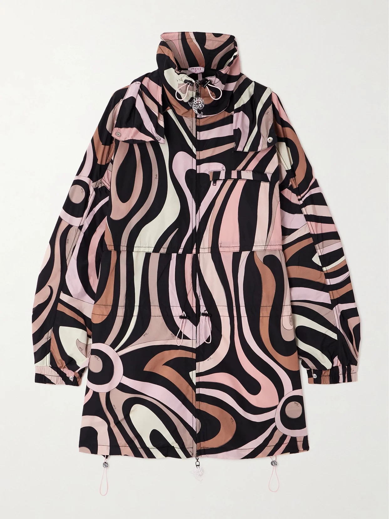 PUCCI's jacket is emblazoned with the label's signature 'Marmo' print, an archival motif that replicates the natural ripples of marble - no two are exactly alike, making each piece one of a kind. It's cut from crisp taffeta and threaded with drawcords through the funnel neck, waist and hem. The zip pulls are strung with the interlocking fish logo.