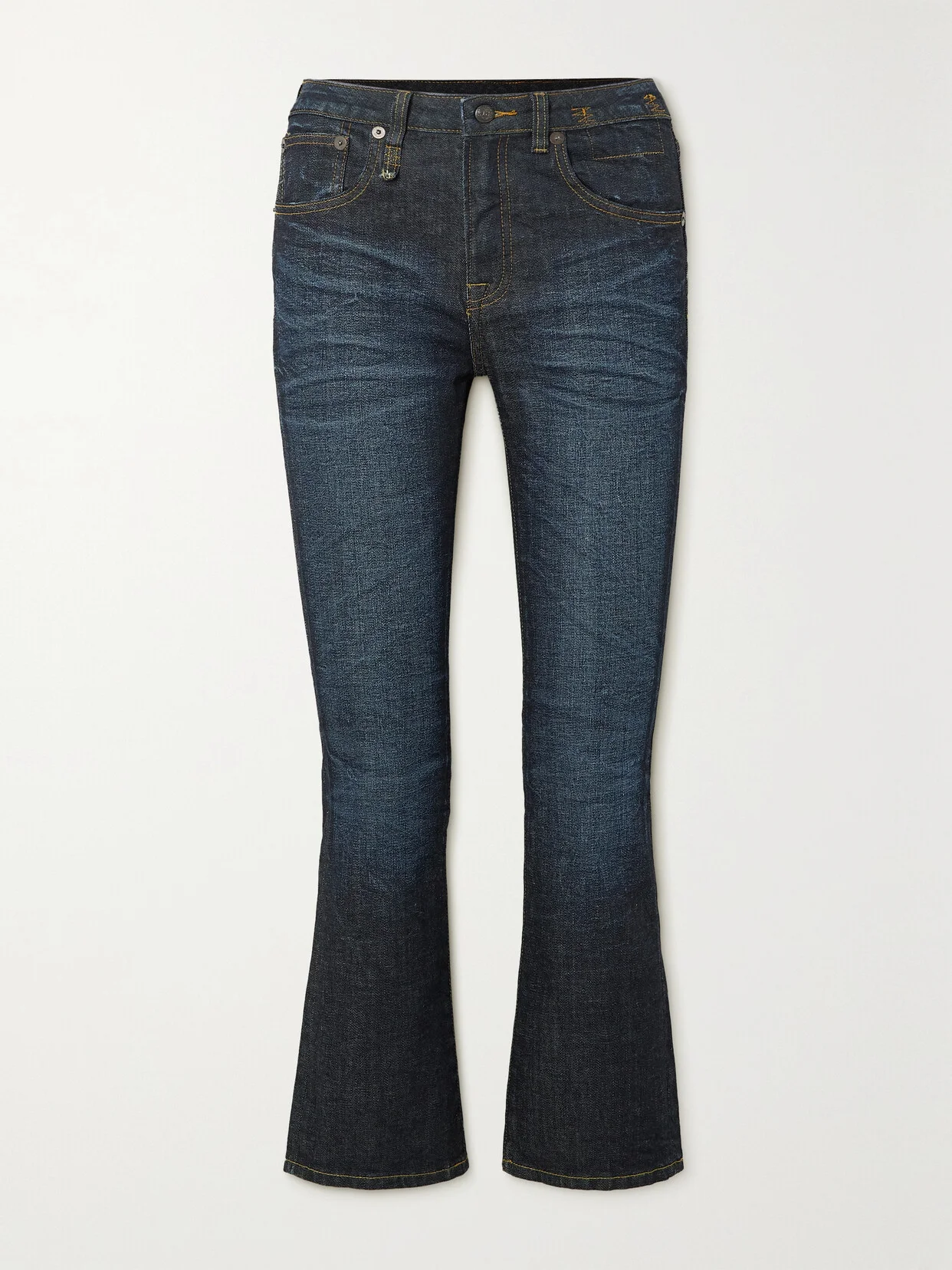 R13's 'Kick Fit' jeans are cut from 'Avery Indigo' denim that's slightly faded to give them an authentic, worn appearance. They have a high-rise waist and flared legs in a cropped, ankle-grazing length. Wear yours with one of the brand's distressed tees.