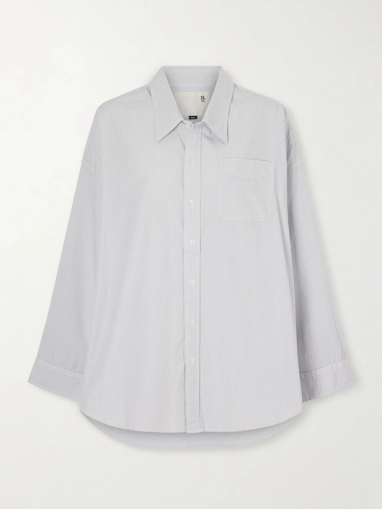 R13's shirt has a cool, oversized silhouette that looks great with the sleeves scrunched and the curved hem partially tucked. It's made from cotton Oxford with classic blue and white stripes and has a neat collar and dropped shoulders. Leave some of the lower buttons undone and wear it with jeans.