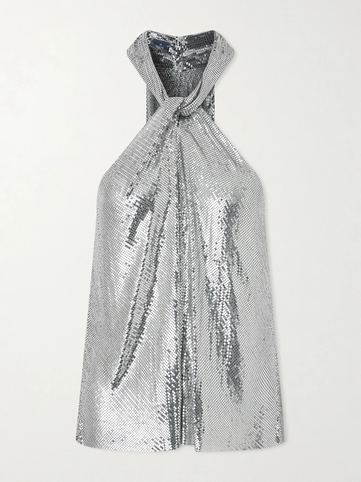 Rabanne's collections will make you feel like the life of the party. This top is made from shiny silver-tone chainmail with knotted halterneck ties. Wear yours with a mini skirt or low-rise jeans.