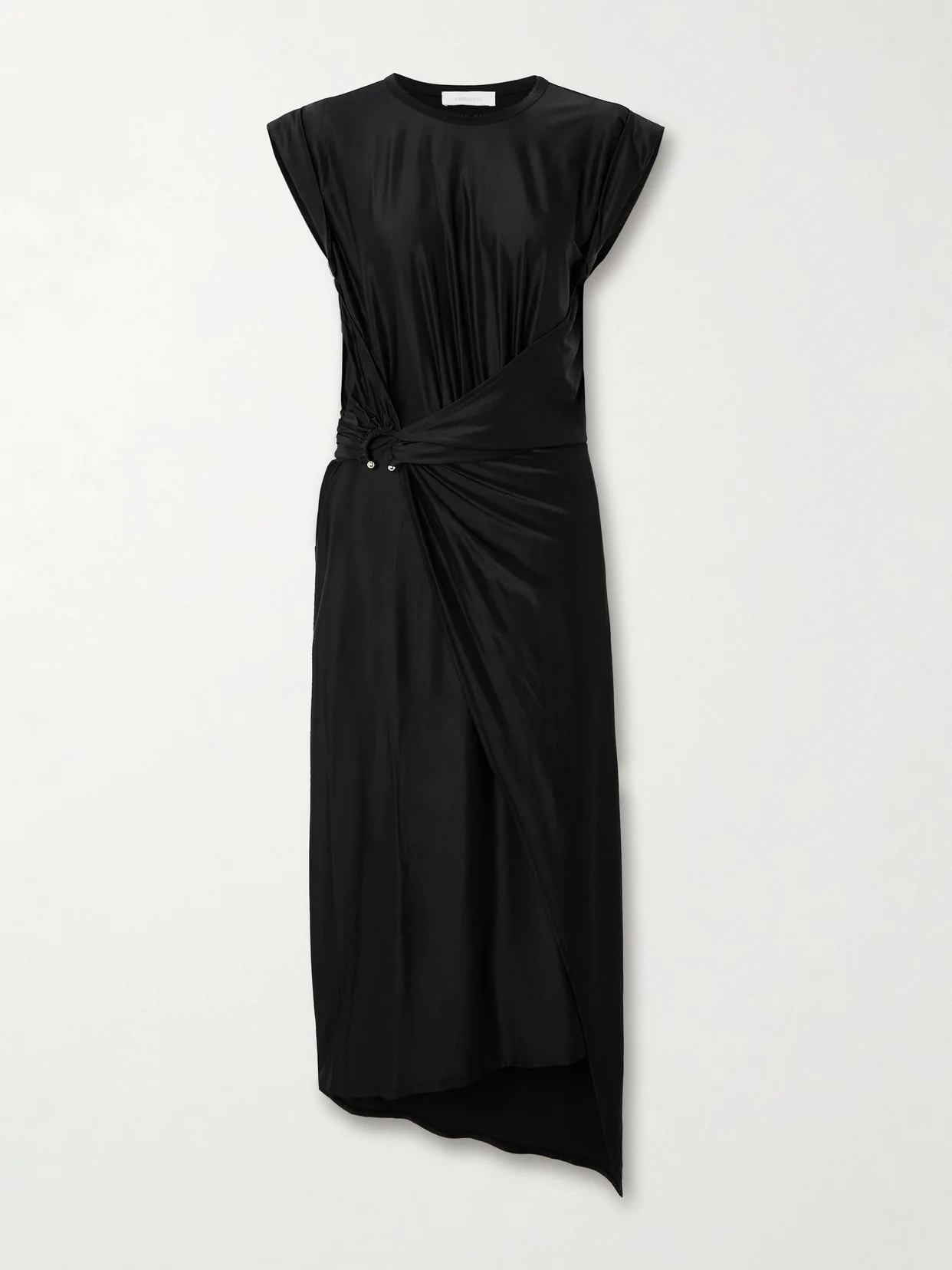 Rabanne's signature embellishments take a new shape with this midi dress. It's made from satin-jersey and has a draped waist held together by a gold-tone metal ring. Draw the eye to the asymmetric hem with statement heels.