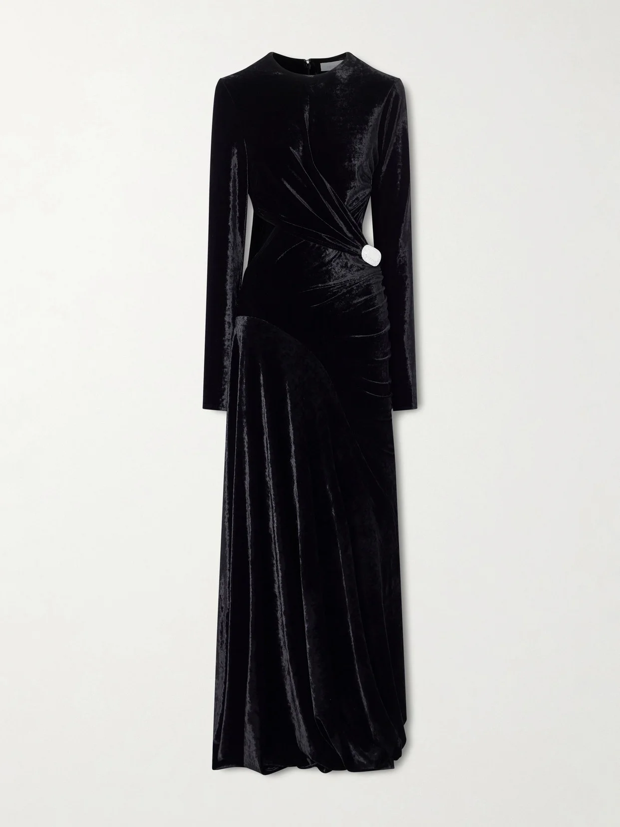 Rabanne's maxi dress is artfully gathered and draped to enhance the luster of the velvet. It's designed for a close fit with a skin-baring cutout, silver-tone buckle and asymmetric hem.