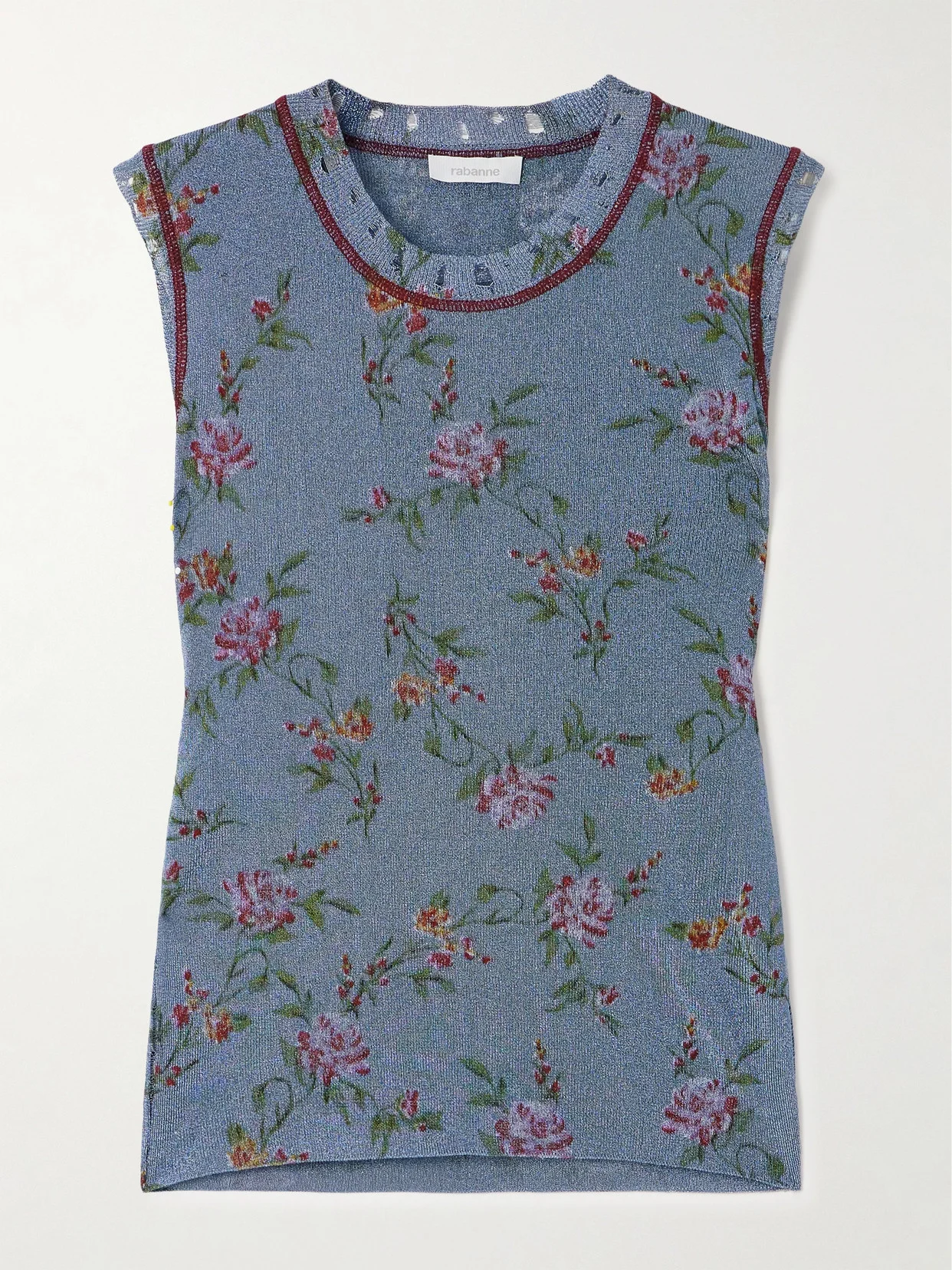 Rabanne's tank is knitted with light-catching metallic threads and features a vintage-inspired floral pattern. It's designed for a slim fit and has contrasting seams along the distressed neckline and subtle cap sleeves.