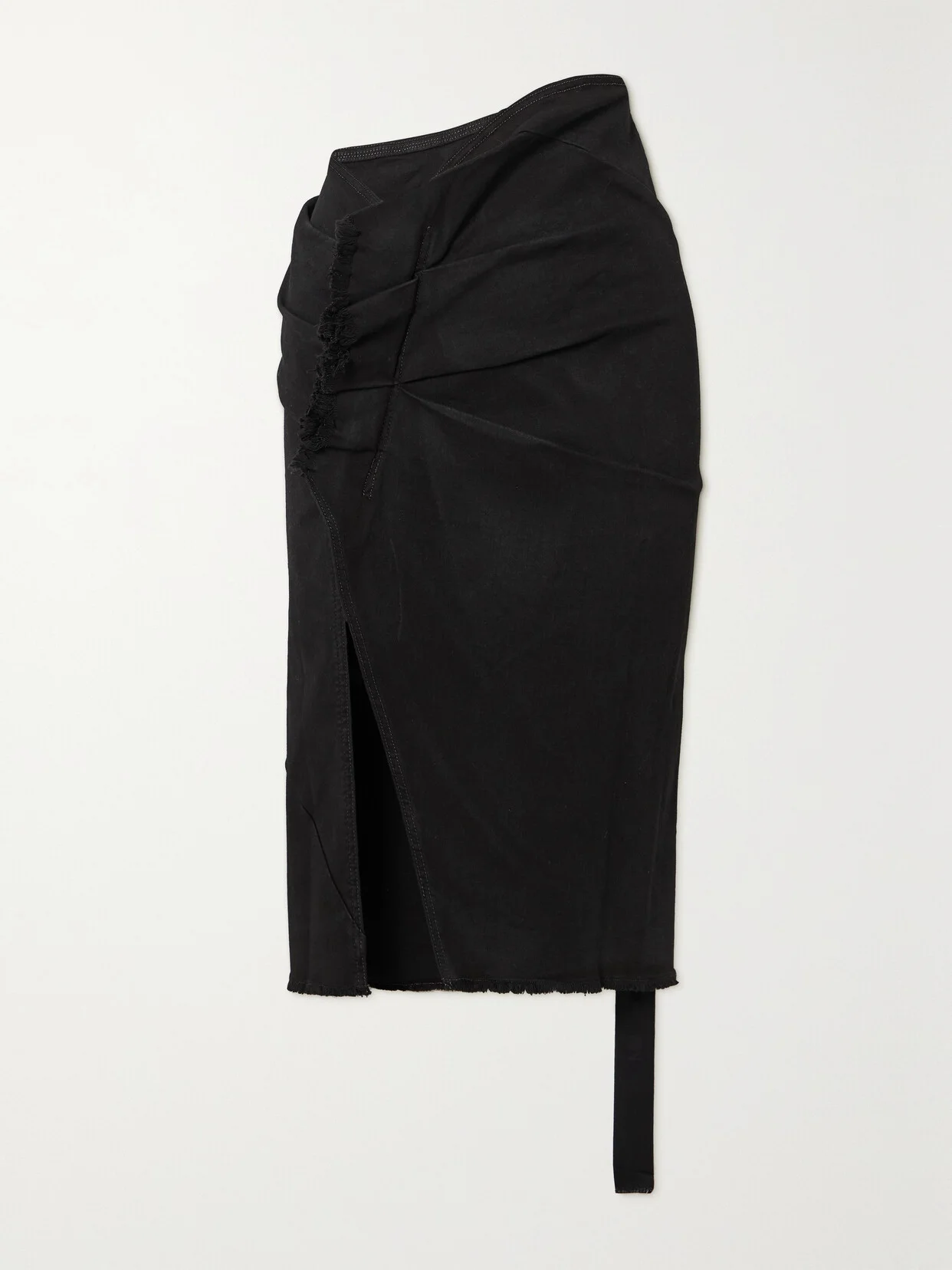 DRKSHDW asymmetric gathered frayed denim midi skirt