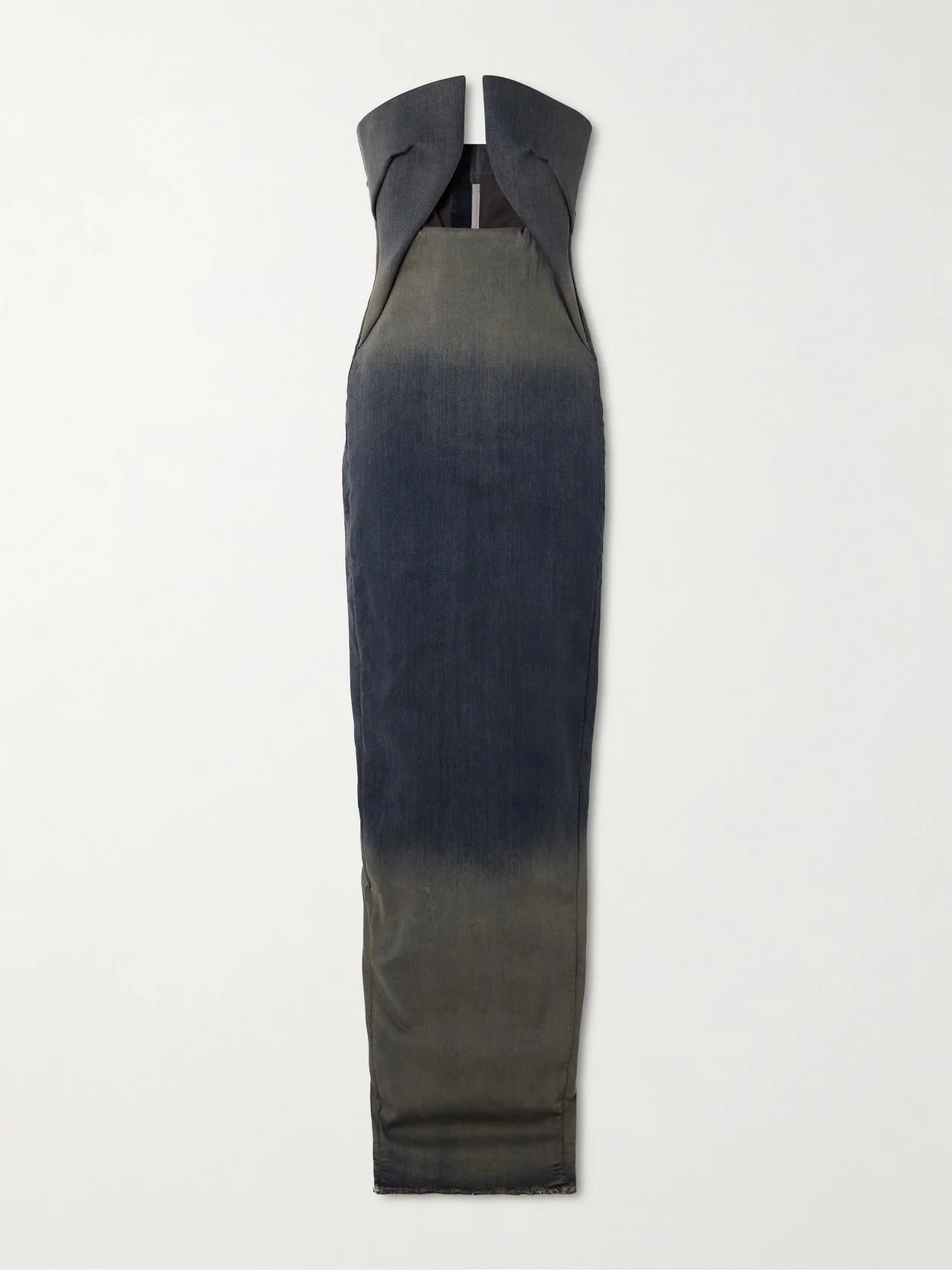 Rick Owens' 'Prong' gown is made from stretch-denim in a degrade wash that looks lived-in and vintage. It has a contemporary structured cutout at the strapless neckline and a daring slit at the back.