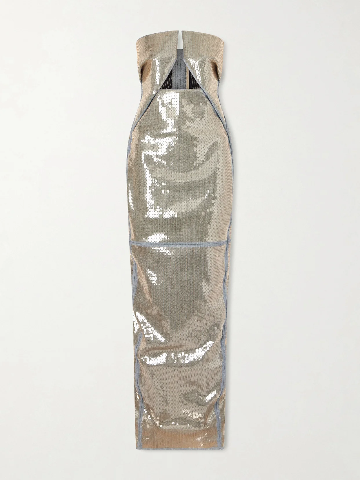 As with anything Rick Owens creates, you can expect the unexpected. Covered with scores of silver sequins for a liquid-like shine, this gown is cut from light-blue denim with a strapless, sculptural bodice. Wear yours with platforms for even more drama.