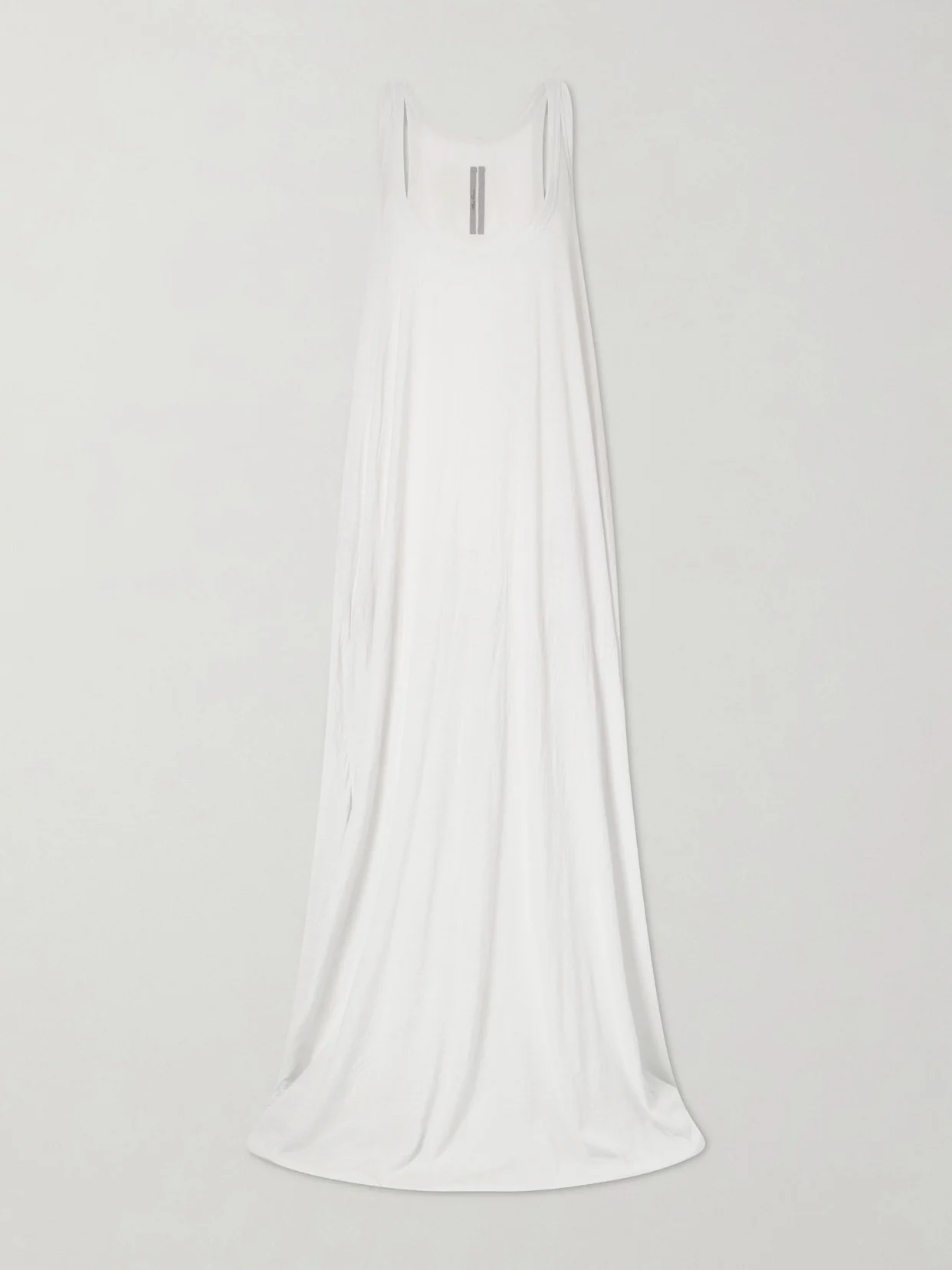 Rick Owens's 'Tank' gown is cut in a fluid, floor-length silhouette with elongated lines and a deep scooped neckline. The minimalist shape and soft drape reflect the label's pared-back, architectural approach. Layer it over a fitted top or wear it alone for a streamlined statement.