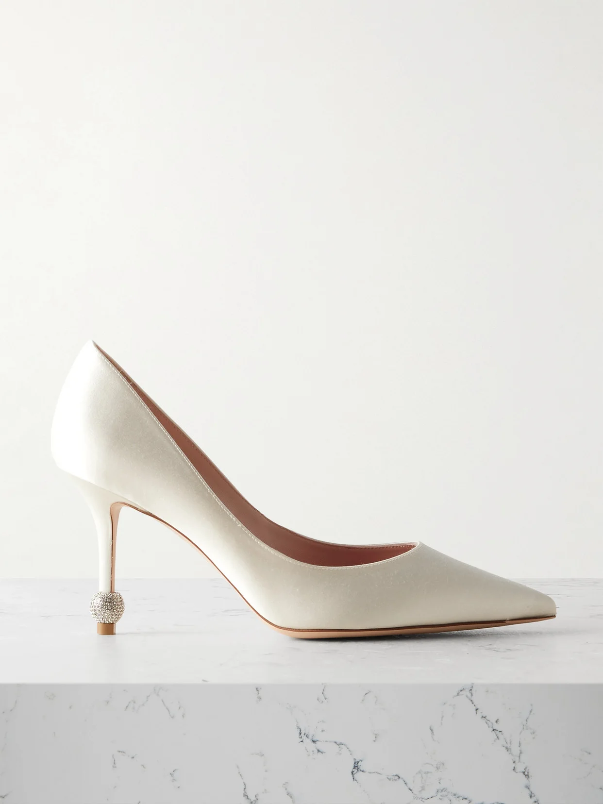 Inspired by a style made for Marlene Dietrich in the '50s, Roger Vivier's pumps have 85mm heels adorned with crystal-embellished spheres. They've been crafted in Italy from ivory satin with elegant pointed toes. Keep the glittery detail in focus with midi and mini hems.
