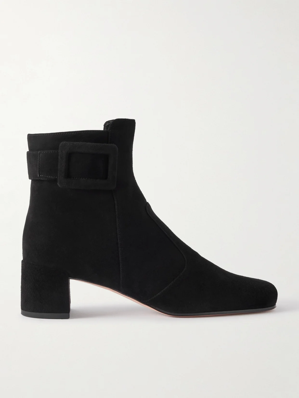 '60s styles inform the shape and expression of Roger Vivier's 'Tres Vivier' ankle boots. They've been crafted in Italy from plush suede and set on practical geometric block heels. The brand's signature buckles decorate each side, so choose hemlines that keep them in focus.