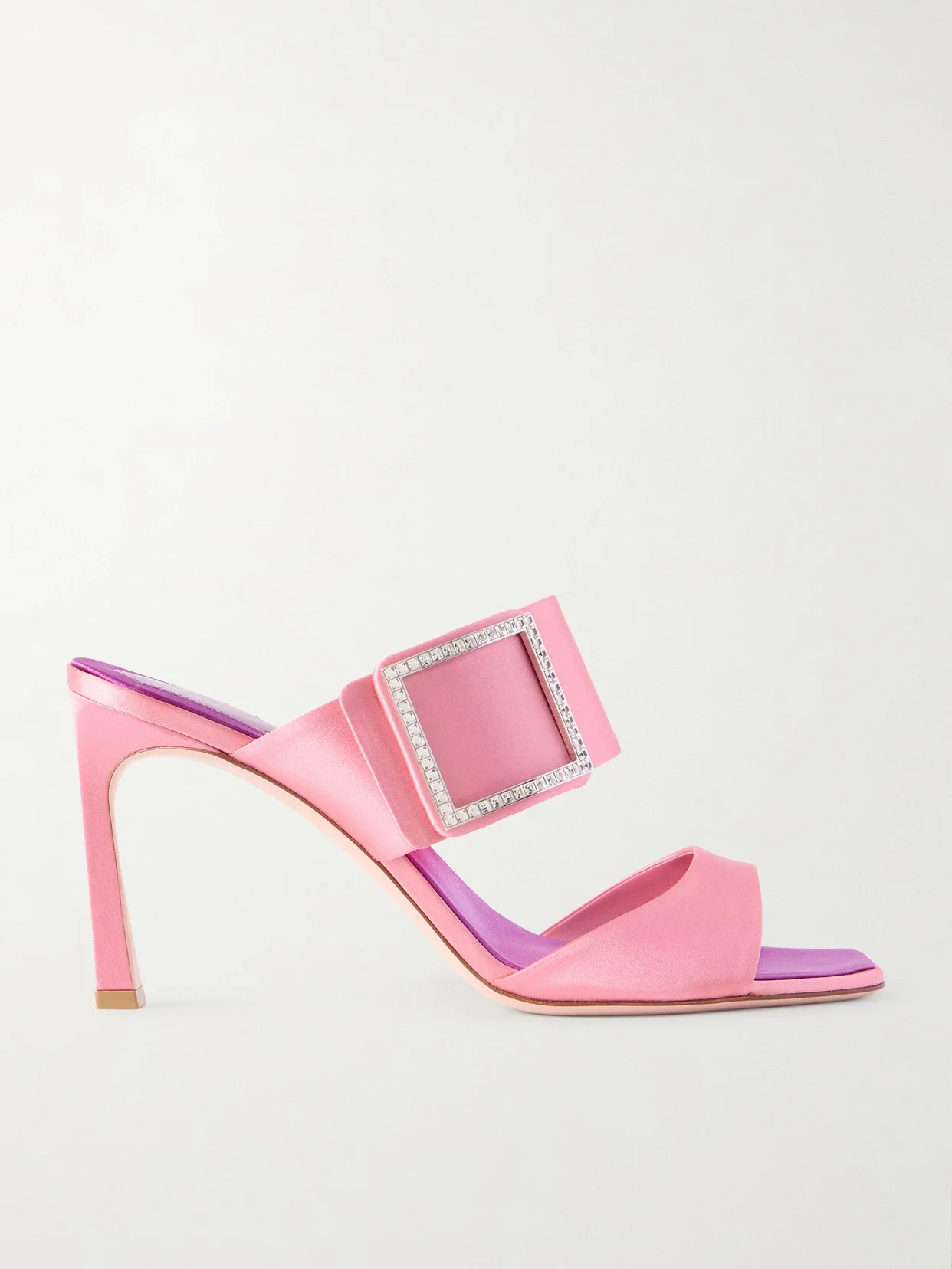 Roger Vivier's 'Trompette' mules will make you feel so ready to party. They're made from pink satin and set on fuchsia footbeds, so they look as beautiful off as they do on. The upper straps are decked with sparkling crystal buckles, while the 85mm stilettos are ideal for dancing.