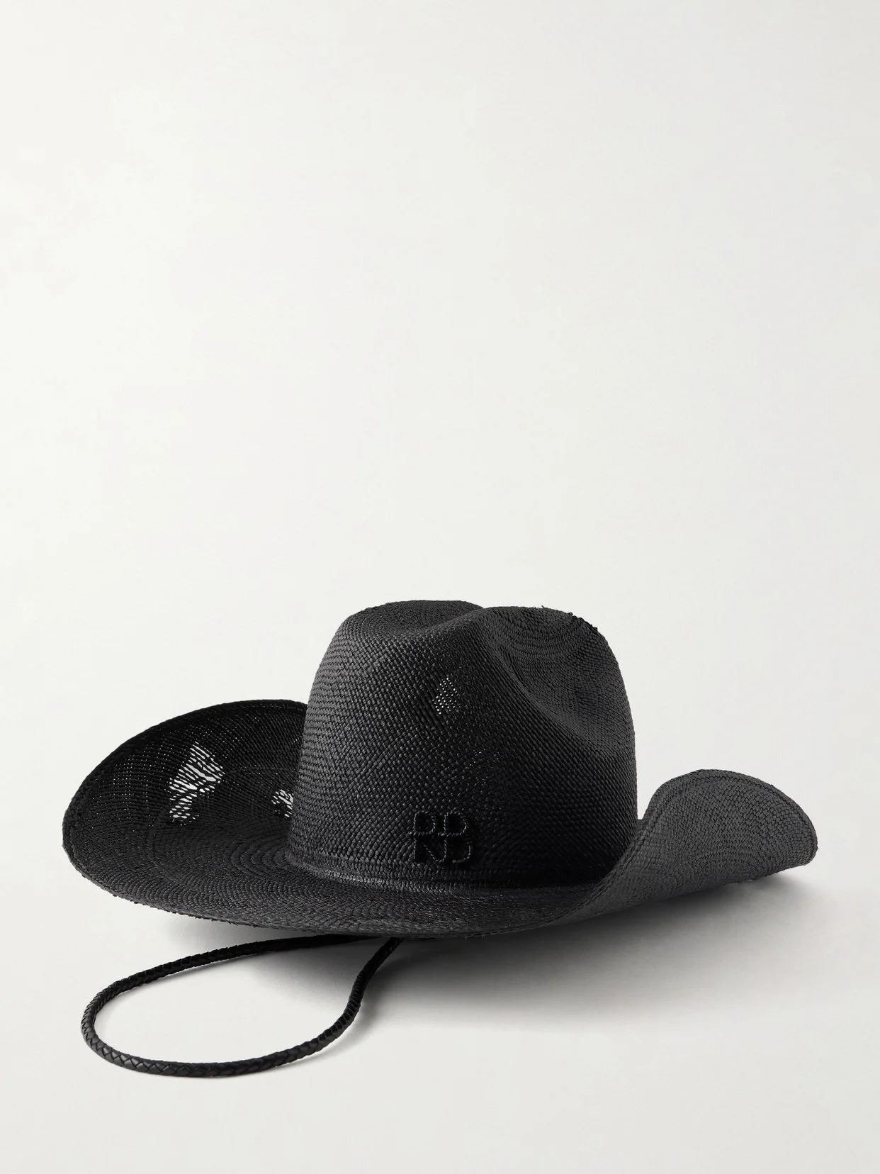 Ruslan Baginskiy reinterprets the charm of classic Western styles with this 'Cowboy' hat. It's traditionally hand-woven from straw using an airy open-work technique that makes it practical for warm weather dressing. The designer's initials are subtly embroidered above the wide brim and it's finished with a woven leather strap.