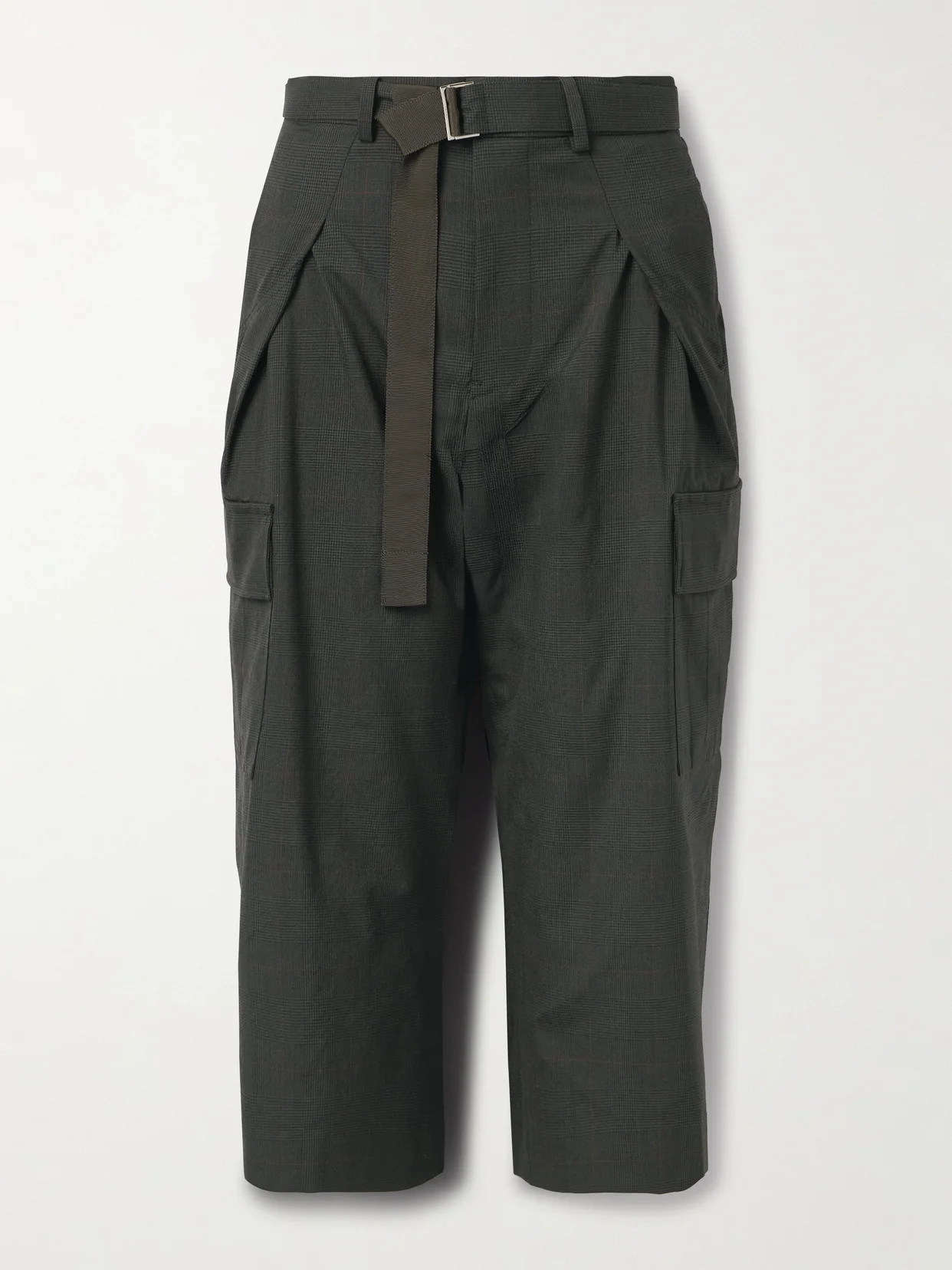 Cropped Belted Pleated Prince Of Wales Checked Wool Tapered Pants