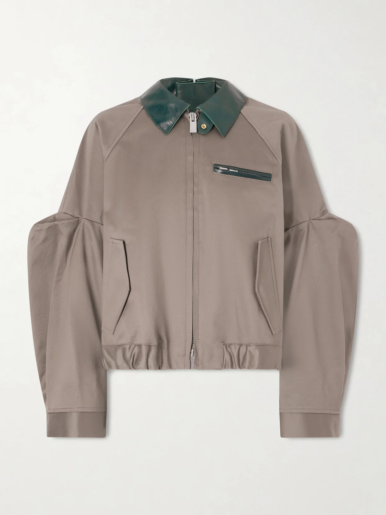 The sleeves on Sacai's blouson jacket are gathered and folded at the elbows to enhance their volume. Made from cotton-twill, it has a leather collar to match the zipped pocket. The pleated back and elasticated hem play up the loose shape.