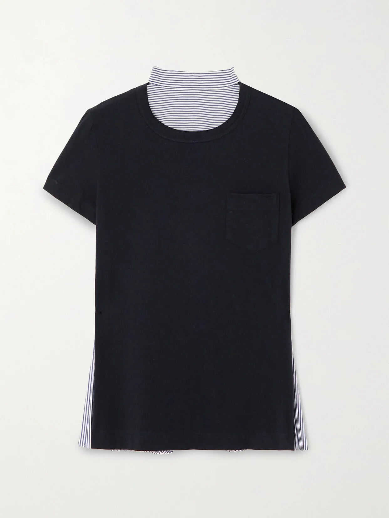 Sacai's experimental approach to design ensures even its more classic clothes feel entirely fresh. This cotton-jersey tee appears simple from the front and turns to reveal a striped poplin panel at the reverse resembling a collared shirt. It's partially pleated for volume and movement and has a chest patch pocket.
