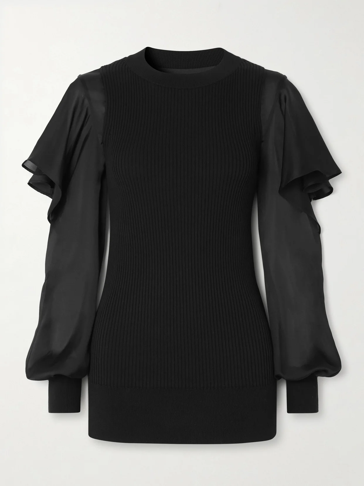 Sacai's top has an ethereal effect with its feminine, ruffled edges. It's rib-knitted from cotton and framed with fluid chiffon sleeves. Style yours with tailored pants or a midi skirt.