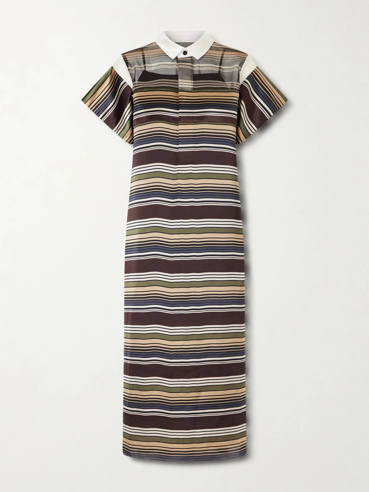 Sacai is renowned for its creative use of fabrics and contrast. This dress is cut from satin in a cascade of colorful stripes and paneled with sheer organza at the base of the white collar.
