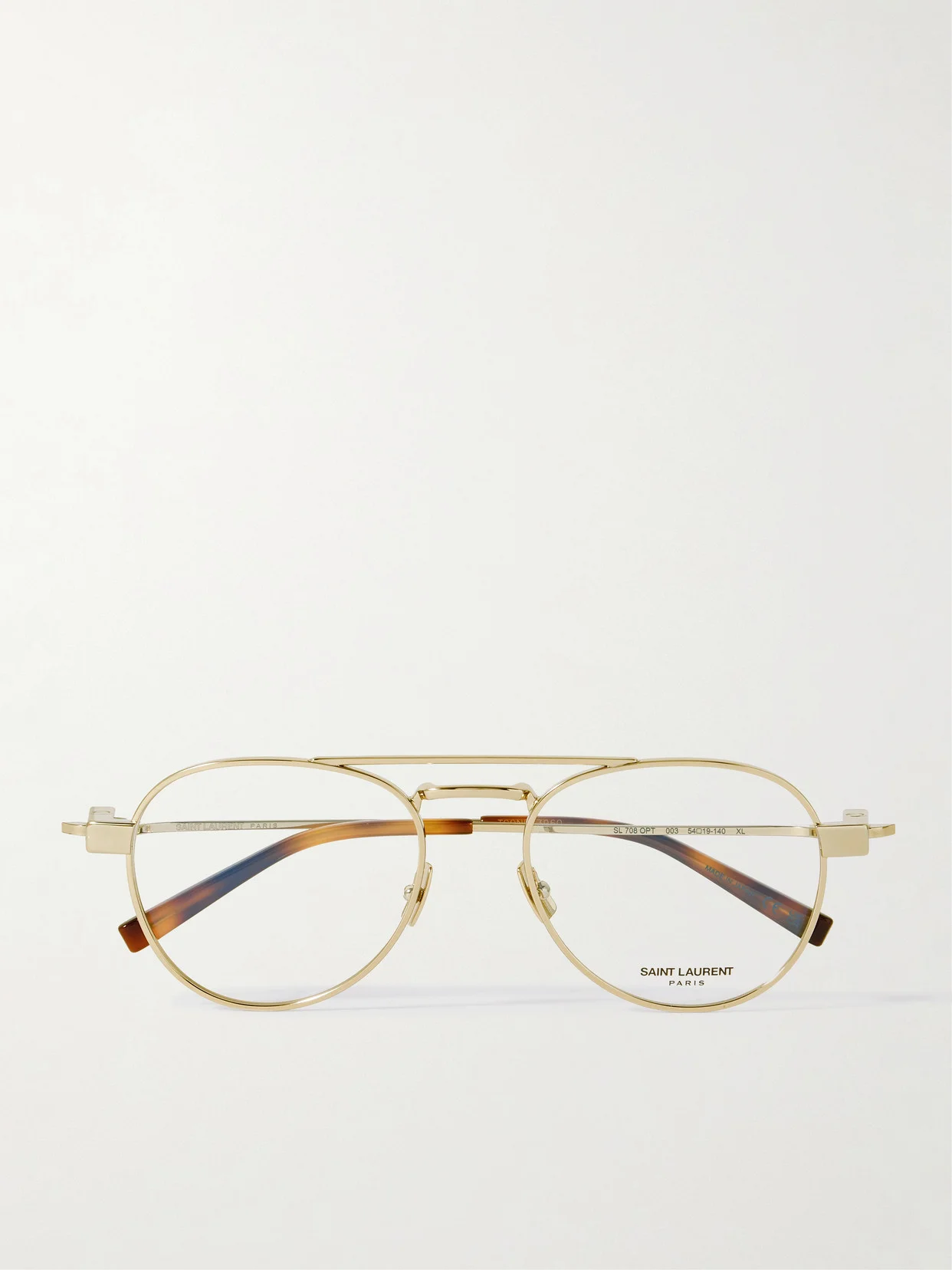 SAINT LAURENT Eyewear's optical glasses have a retro, '70s-esque brow bar. They have fine gold-tone metal frames, bringing a lightness to the aviator silhouette.