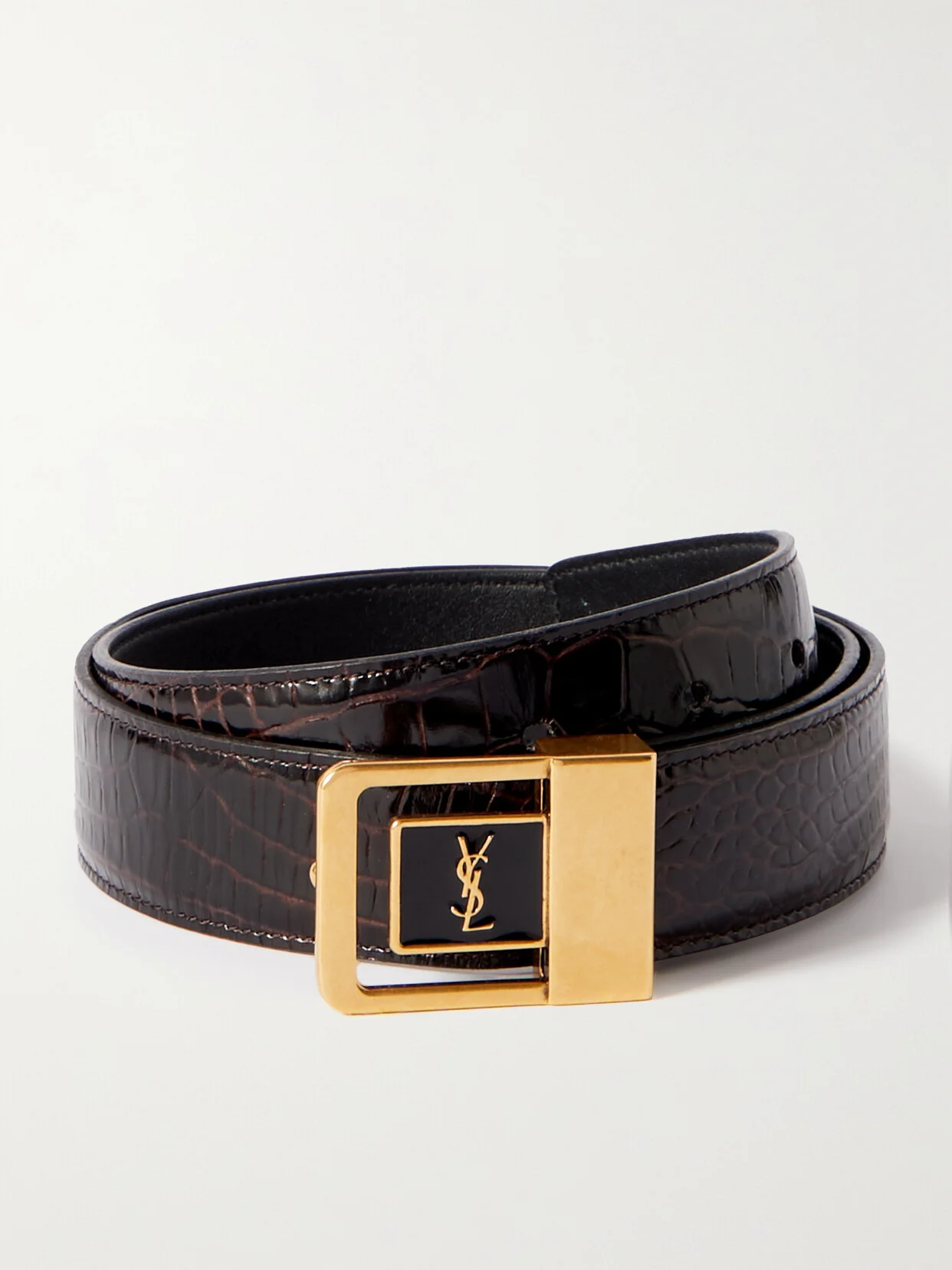 SAINT LAURENT's belt features the brand's instantly recognizable 'YSL' moniker in an Art Deco-style setting. It's made from glossy croc-effect leather offset with a polished gold-tone buckle.