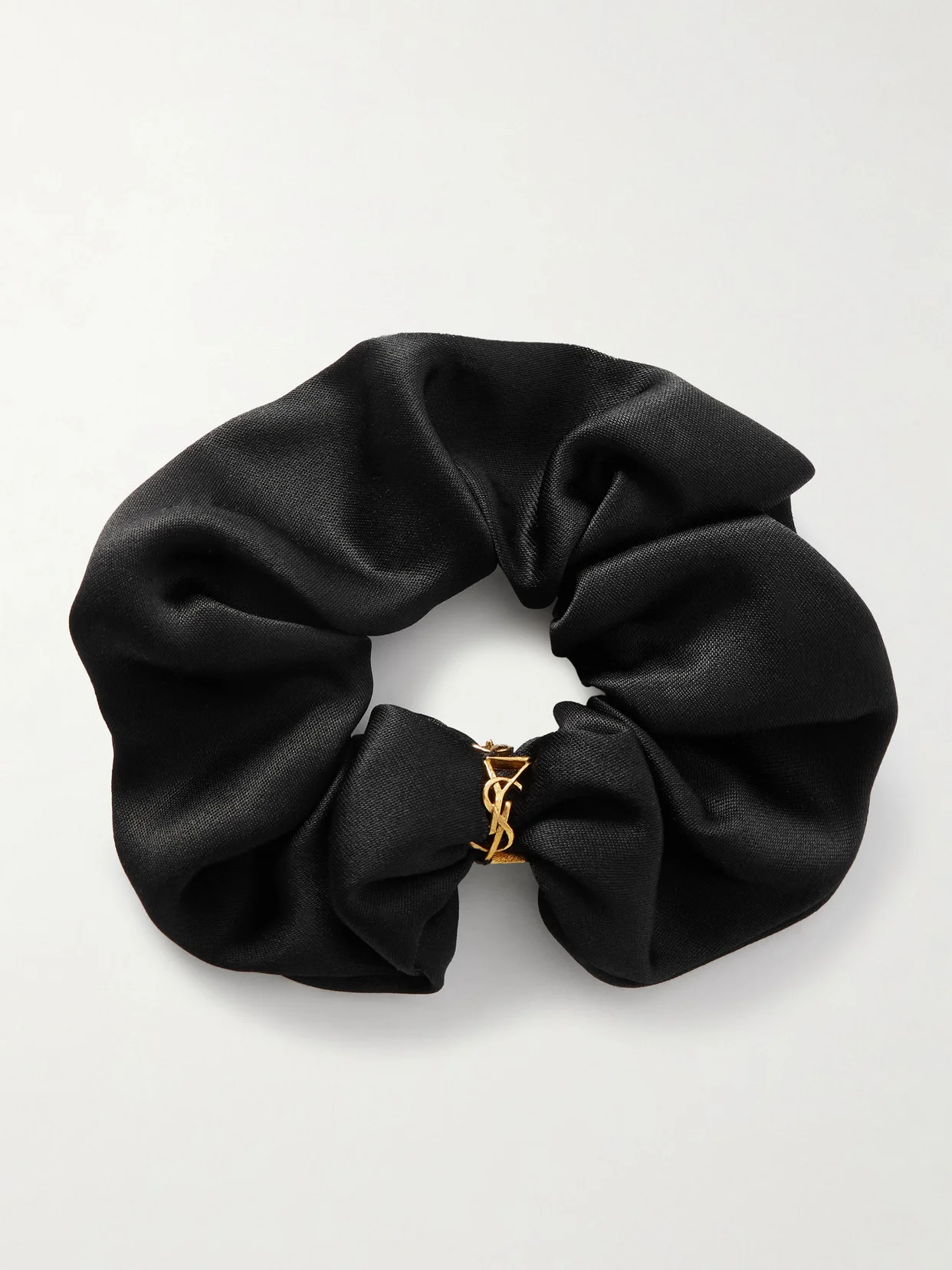A keen eye for details defines SAINT LAURENT's collections, right down to the finishing touches. This hair scrunchie is made from smooth silk-satin that's gathered and finished with the maison's iconic interlocking 'Cassandre' embellishment.