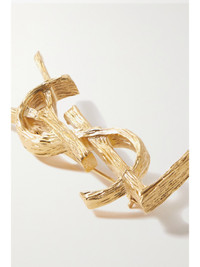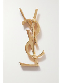 Designed by graphic artist Cassandre, also known as Adolphe Jean Marie Mouron, SAINT LAURENT's interlocking logo has been synonymous with the house since its debut in 1961. This gold-tone brooch is cast in the shape of the iconic monogram and engraved with stripes. Fasten yours on the lapel of a blazer.