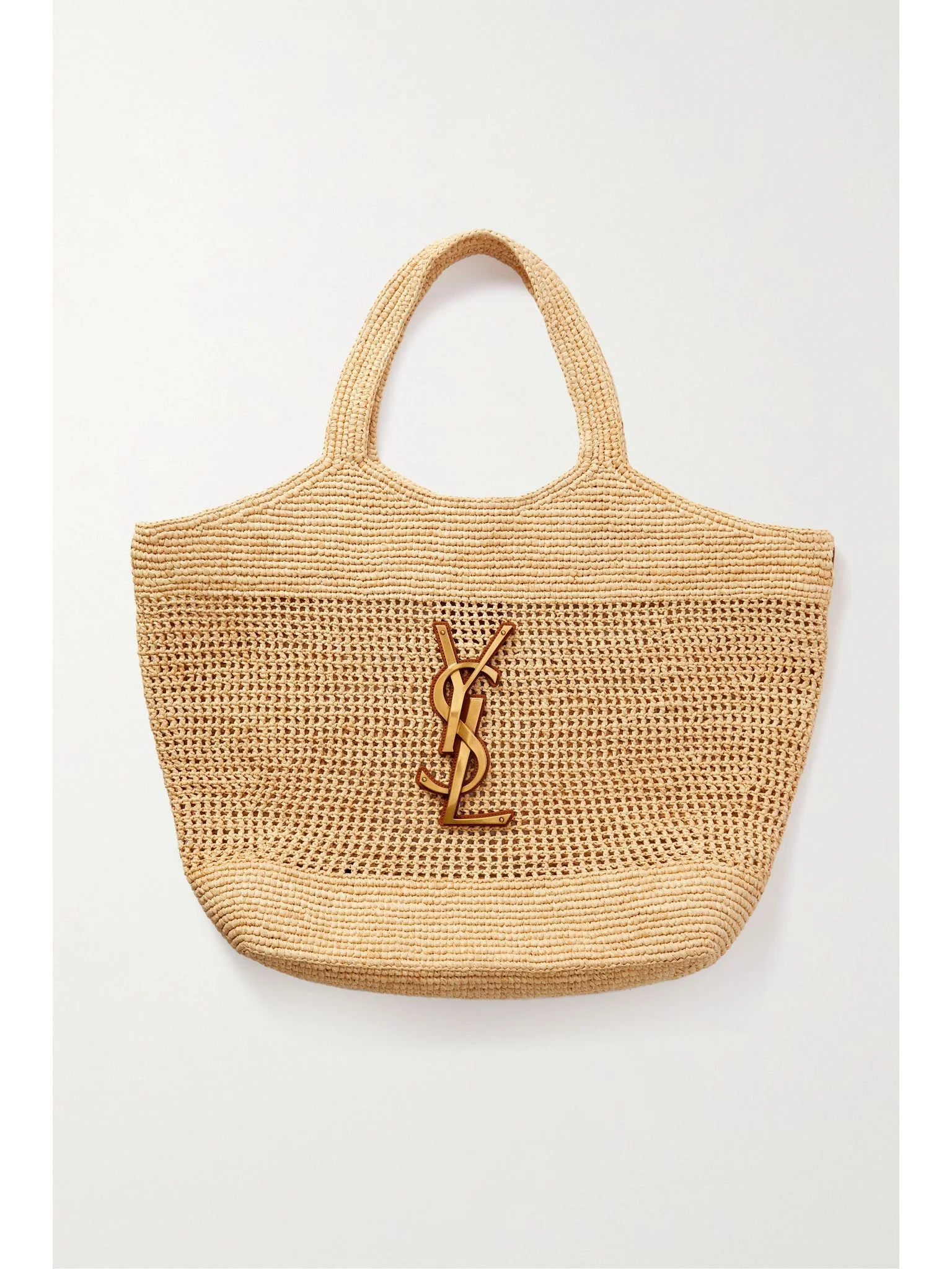 SAINT LAURENT steps up the humble beach tote with this 'Icare' design and its supersized, leather-trimmed gold monogram. Woven from raffia with a panel of open stitching, it feels light and airy while effectively concealing your possessions. Details & Care - Raffia, brown leather (Calf) - Open top