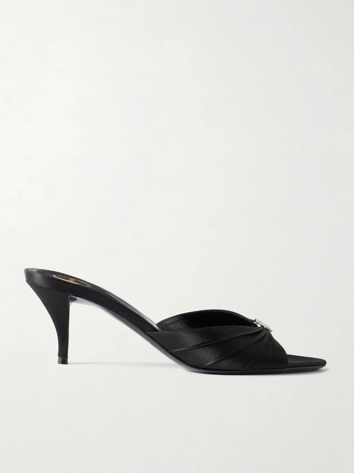 Gracefully simple, SAINT LAURENT's 'Jerry' mules are a versatile choice. Resting on a 60mm heel, they're made from black satin and detailed with an embellished 'YSL' plaque at the center.