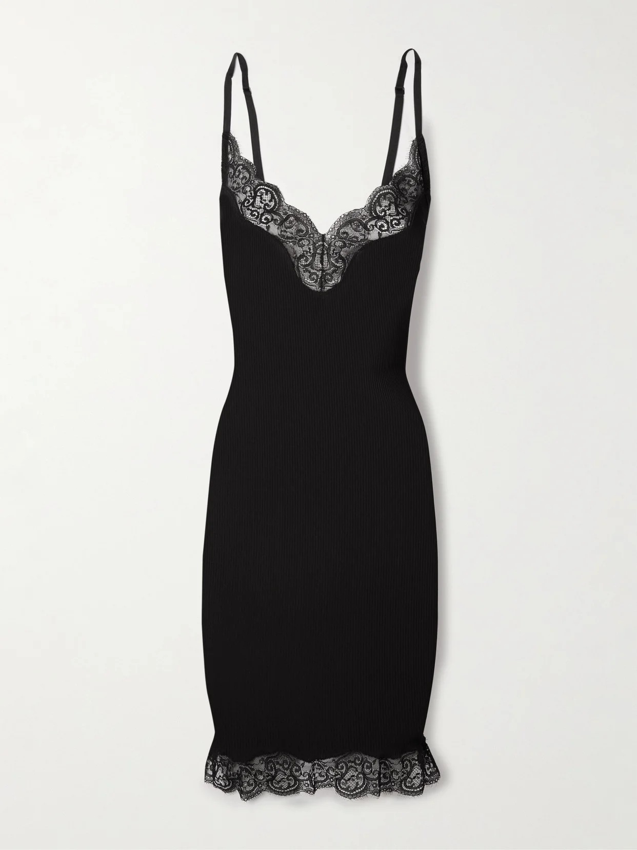 SAINT LAURENT's mini dress recalls lingerie. Trimmed with delicate scalloped lace along the V-neck and hem, it's made from ribbed silk-jersey that hugs your figure and has adjustable straps to perfect the fit. Underpin yours with adhesive cups.