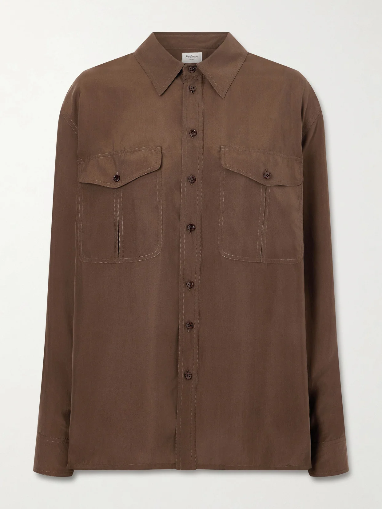 Transforming classic menswear into avant-garde womenswear is what SAINT LAURENT has built its legacy on. Crafted in Italy from lightweight habotai silk, this workwear shirt features two flap pockets on the front and a pointed collar. Wear it on its own or layer it over a turtleneck top.