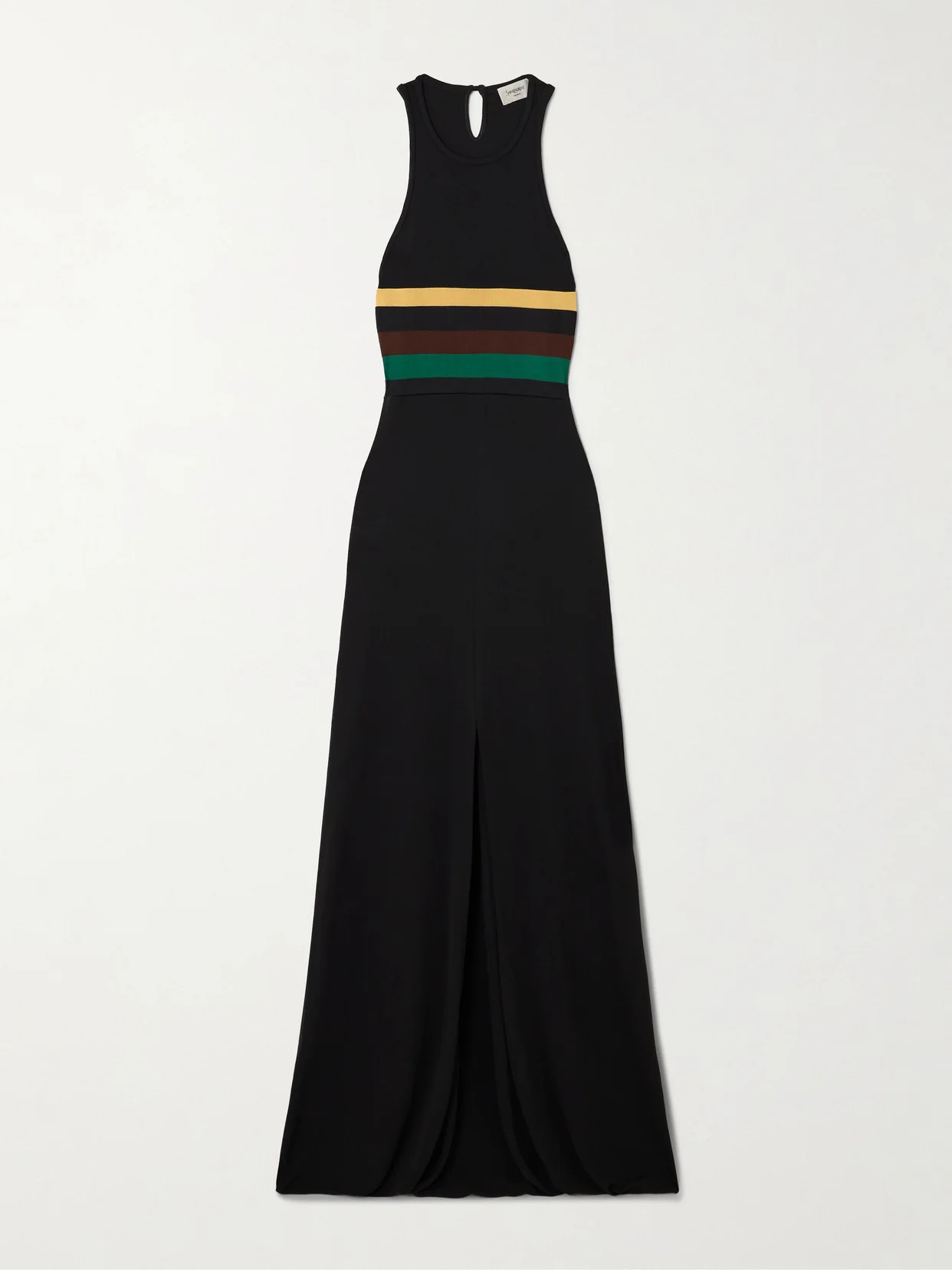 SAINT LAURENT's dress features a tricolor of brown, green and yellow stripes giving it a sporty, retro feel. It's been made in France from soft crepe-jersey and has a floor-length skirt with a deep front slit.
