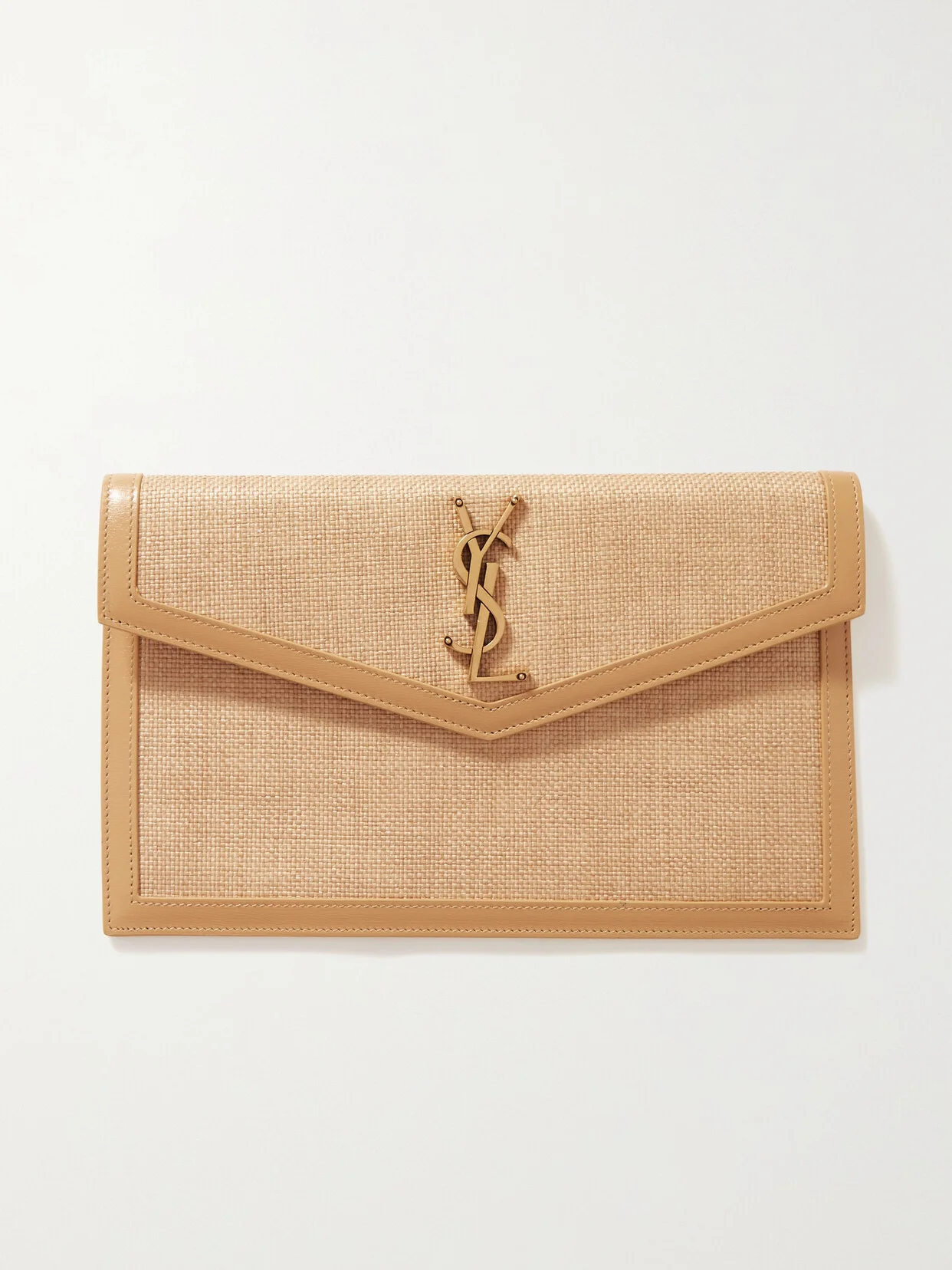SAINT LAURENT's iconic 'Uptown' pouch has been given a seasonal update just in time for summer. It's been crafted in Italy from raffia and trimmed with leather to protect the edges. The front is embellished with the house 'YSL' motif.
