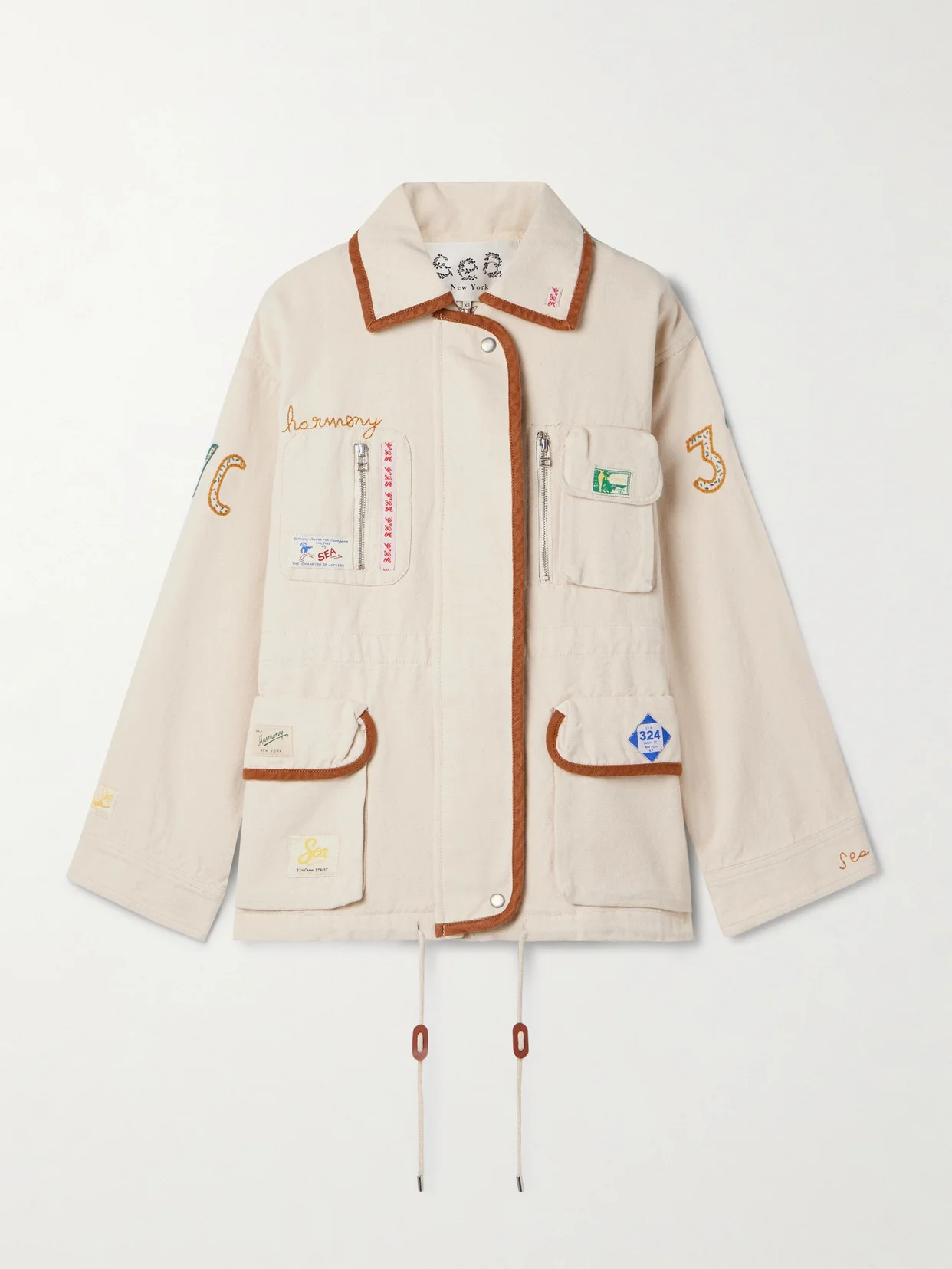 Inspired by workwear styles, Sea's 'Carolyn' jacket is appliqued and embroidered with a variety of playful patches and numbers to give it a more personalized feel. It's made from durable cotton-canvas and has contrasting trims and adjustable drawstring ties at the hem. The loose fit allows for easy layering.