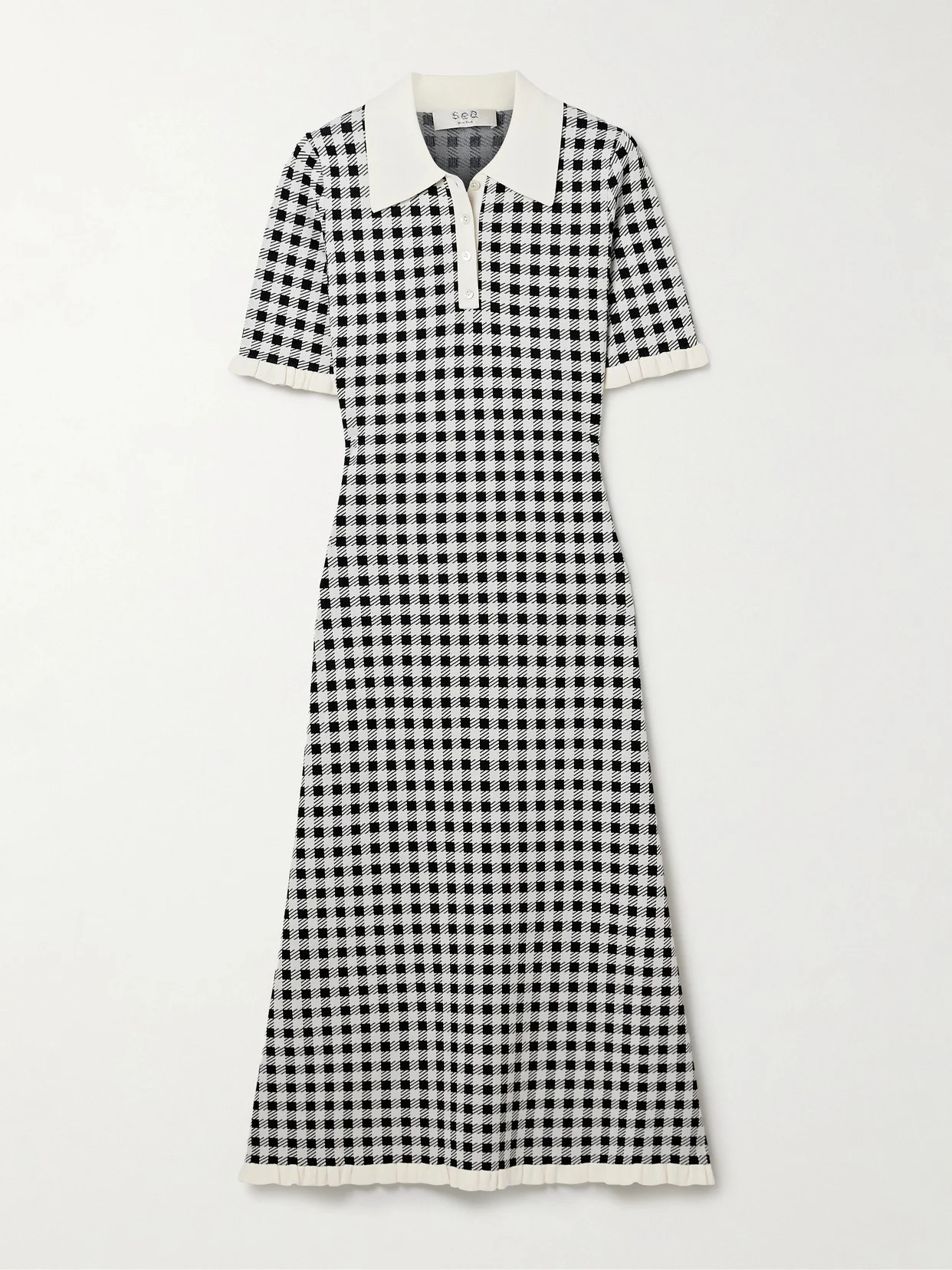 Sea's 'Saige' midi dress is jacquard-knitted with monochrome checks. It's detailed with a classic polo collar and ruffles along the cuffs and hem.