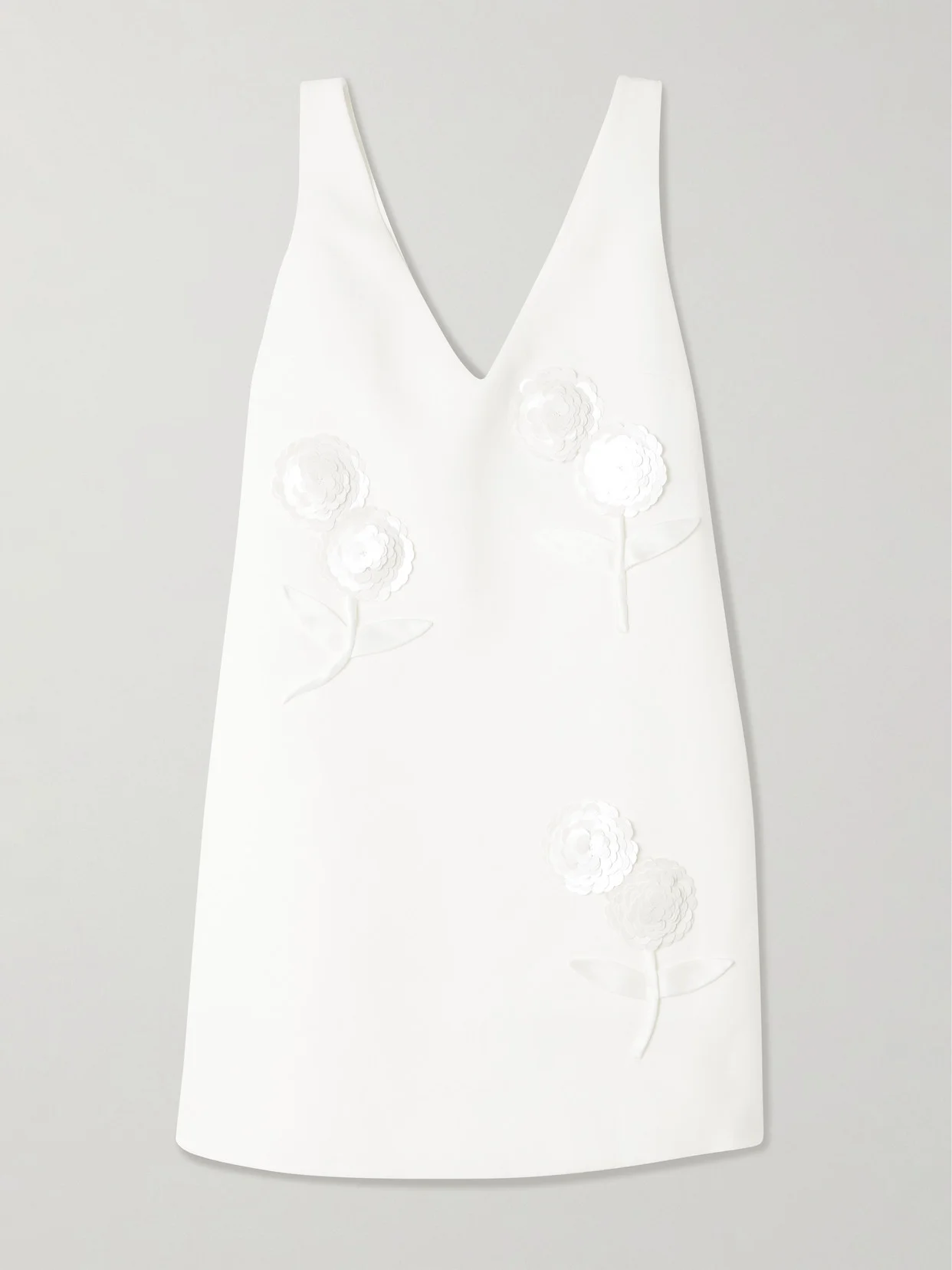 Self-Portrait's mini dress is appliqued with sequined flowers that catch the light so beautifully. Cut from smooth white crepe in a mini shift silhouette, it's perfect for your wedding reception or events leading up to the big day.