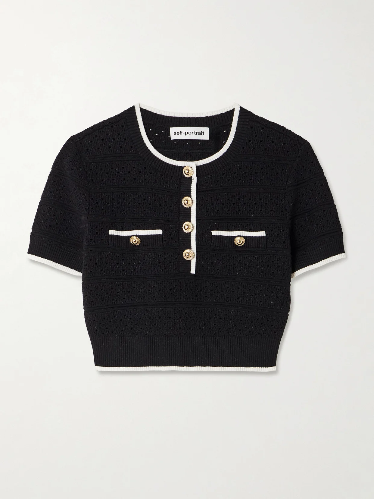 There's an air of vintage glamor to Self-Portrait's top. Pointelle-knitted from cotton-blend, it's flecked with glistening metallic threads and has contrasting trims to accentuate the boxy, cropped shape. Match your jewelry to the gleaming gold-tone buttons.