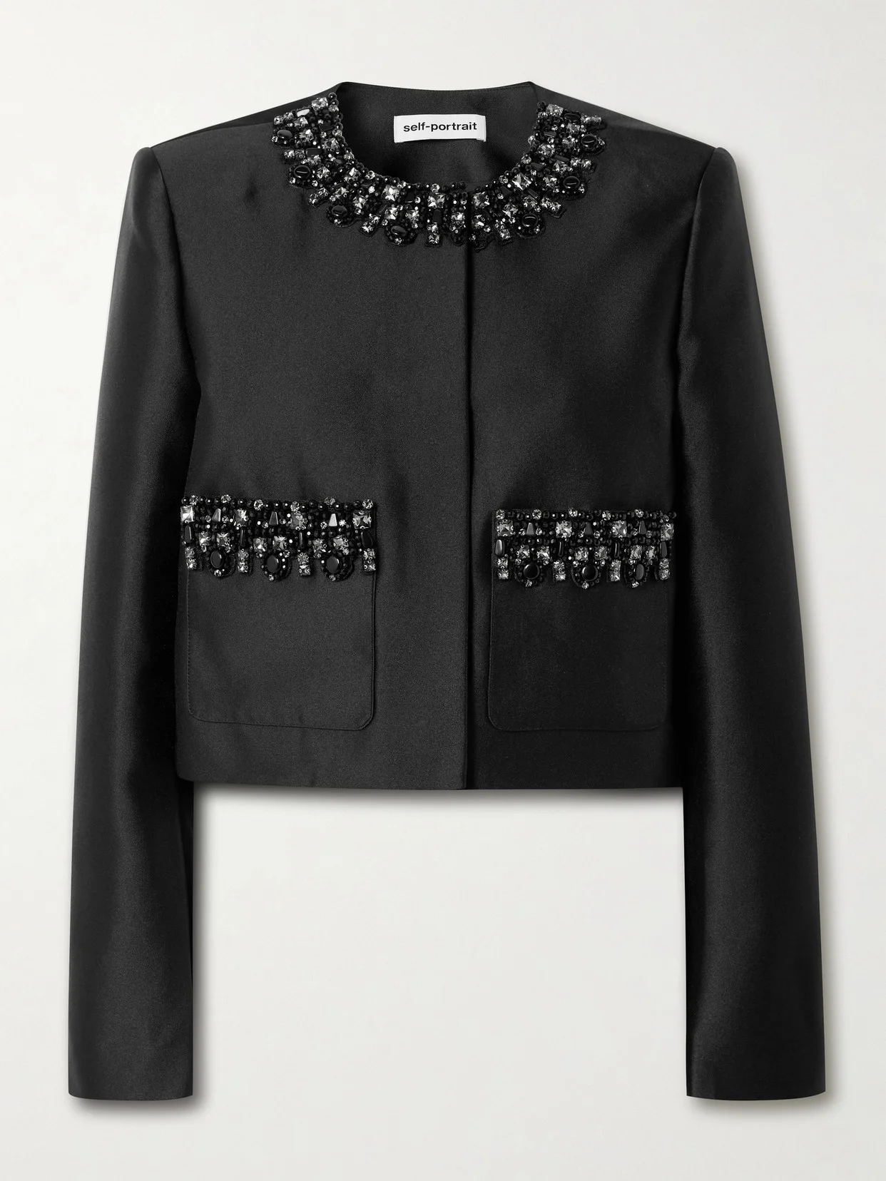 Self-Portrait's Fall '25 collection plays on retro tailoring. This jacket is cut from taffeta in a '60s-inspired boxy shape with sparkling embellishments on the patch pockets and along the round neckline. Style yours with a tailored skirt or the matching mini dress from our edit.