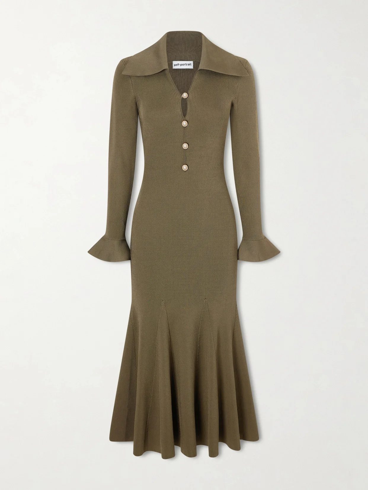 Self-Portrait approaches occasion dressing with a romantic yet modern sensibility. Made from ribbed-knit, this midi dress has softly ruffled cuffs and faux pearl and crystal buttons along the front. Style yours with neutral heels and minimal jewellery for an elegant evening look.