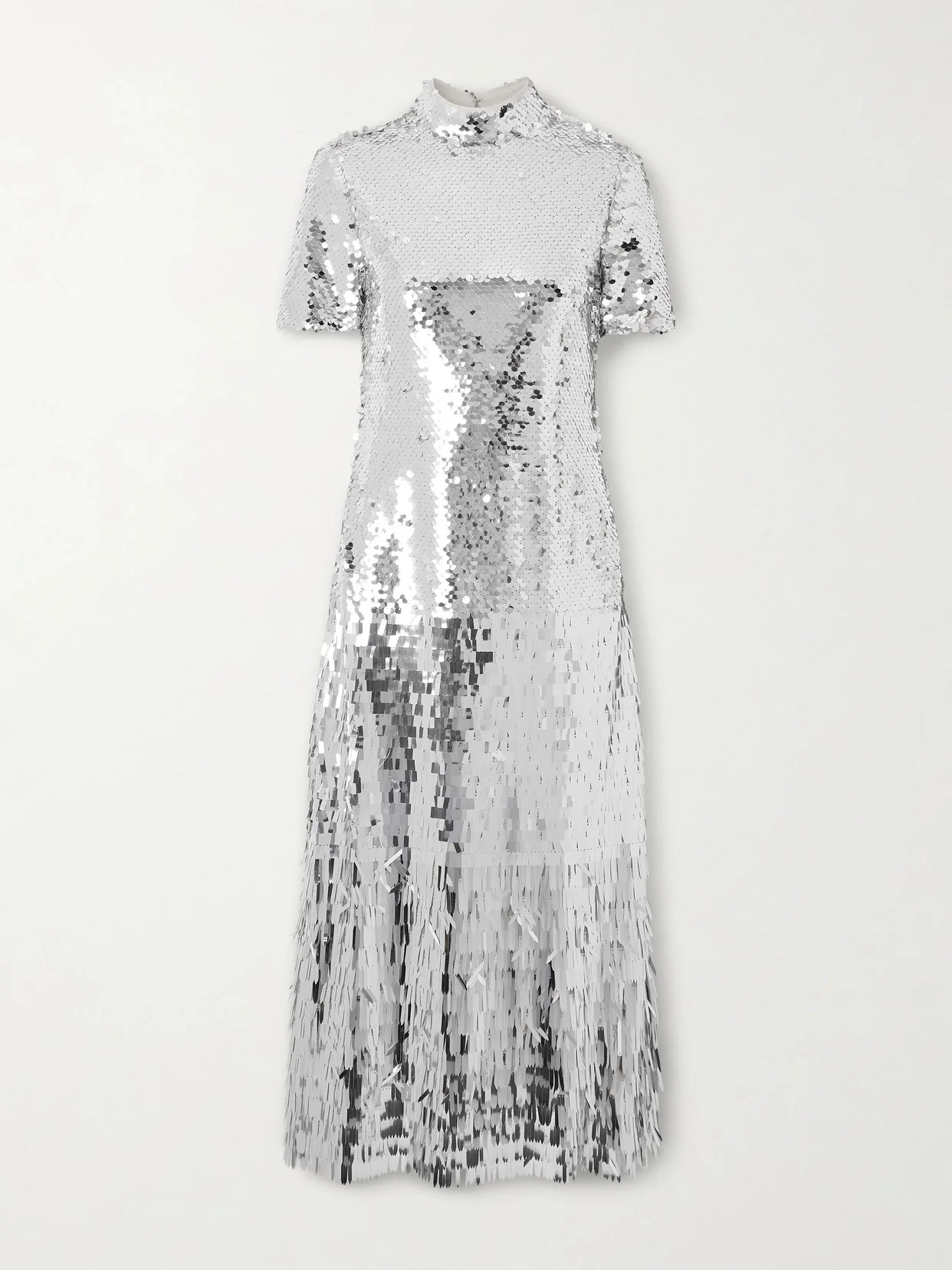 Self-Portrait's dress is just sensational. Made from tulle, it's embellished with a mixture silver sequins, including longer ones that create a feather-inspired fringed hem. We love how chic the mock neckline is, too.