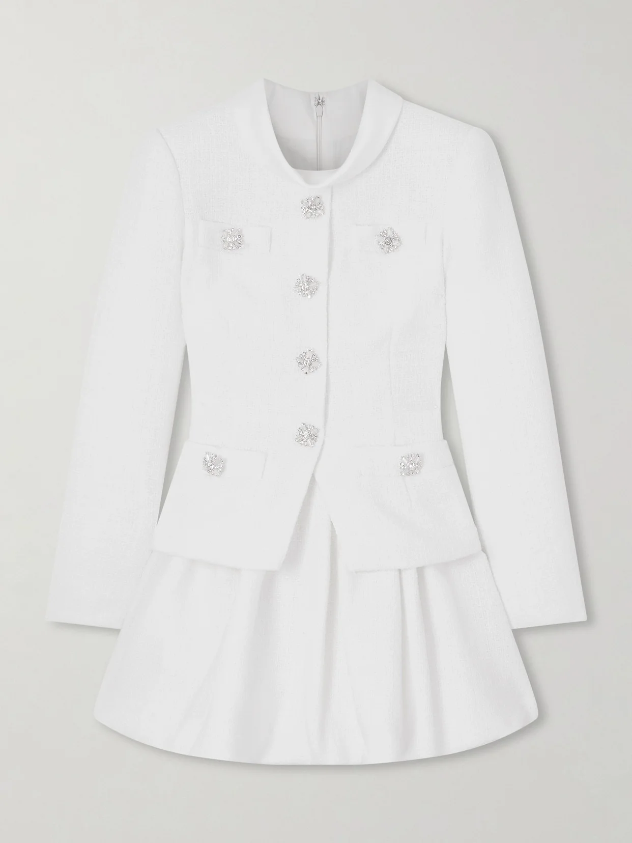 Designed with a voluminous bubble skirt, Self-Portrait's dress feels both sophisticated and playful. Made from boucle-tweed, it has a chic jacket-inspired bodice and high satin-twill neckline. Let the statement crystal-embellished buttons shine with minimal accessories.