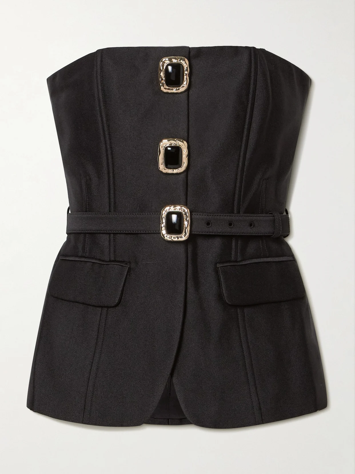 Self-Portrait's bustier top is ultra glamorous. Made from satin-twill, it's fitted with internal boning for definition and has a coordinating belt to cinch the waist. The paneled front is fitted with flap pockets and '80s-inspired ornate buttons.