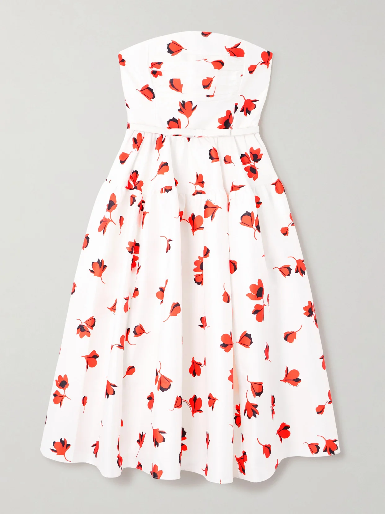 Strapless Belted Ruched Floral-print Taffeta Midi Dress
