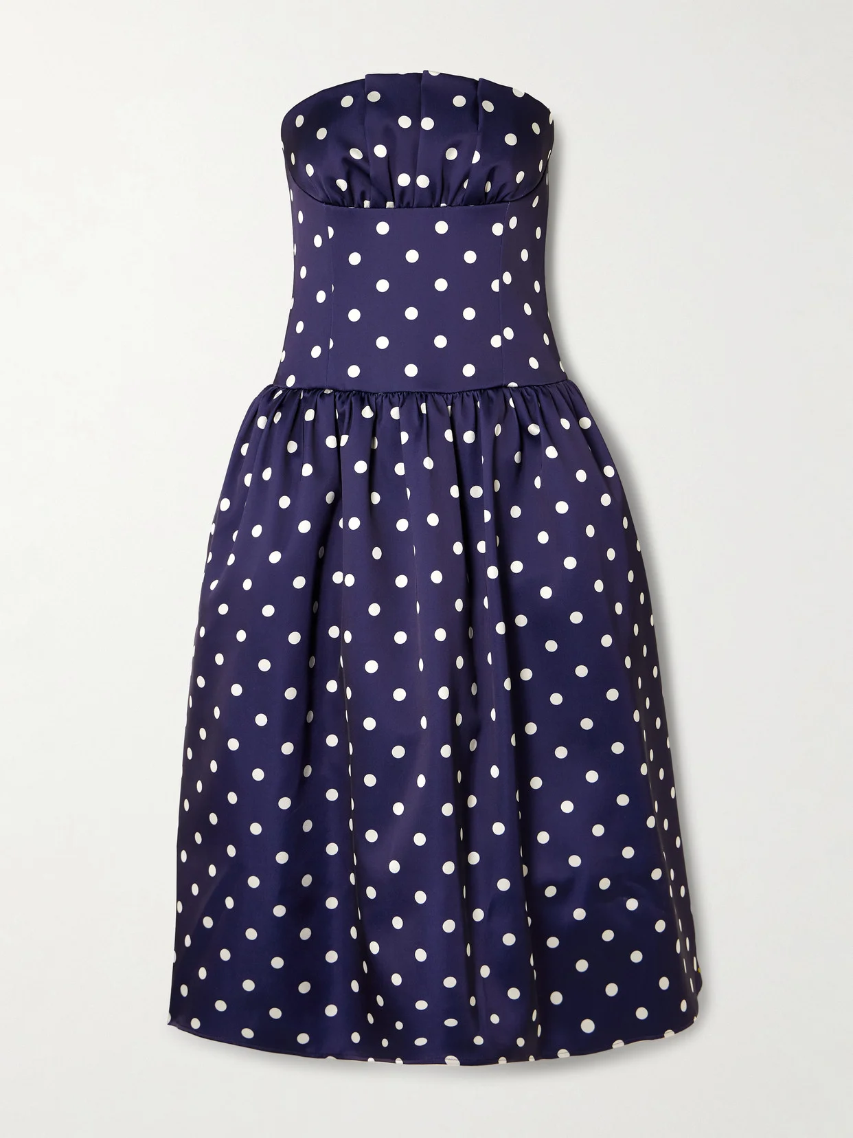 Self-Portrait's dress embodies timeless retro glamour. Made from polka-dot satin, it has a strapless pleated bodice evocative of corset styles and falls to a voluminous gathered skirt. Wear yours with diamond drop earrings and kitten heel pumps.