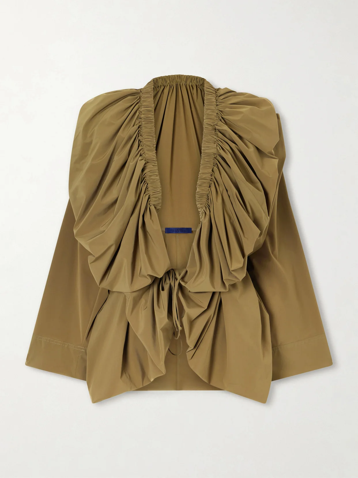 Fluid drapery and bold proportion define the work of Sharon Wauchob. The 'Sata' wrap blouse is crafted from wool and silk-blend crepe with dramatic gathers at the neckline and shoulders, while voluminous sleeves and a wrap front create soft, sculptural folds.