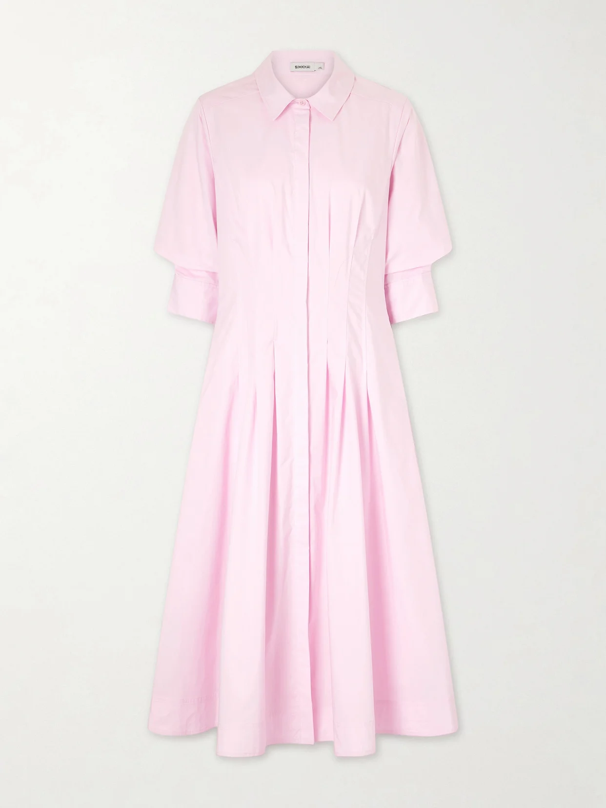 SIMKHAI updates the classic shirt dress with a darted, nipped-in waist that creates pleats through the full skirt. This 'Jazz' style is made from cotton-blend poplin and has voluminous short sleeves and a smart collar. Wear it with strappy sandals or sneakers.