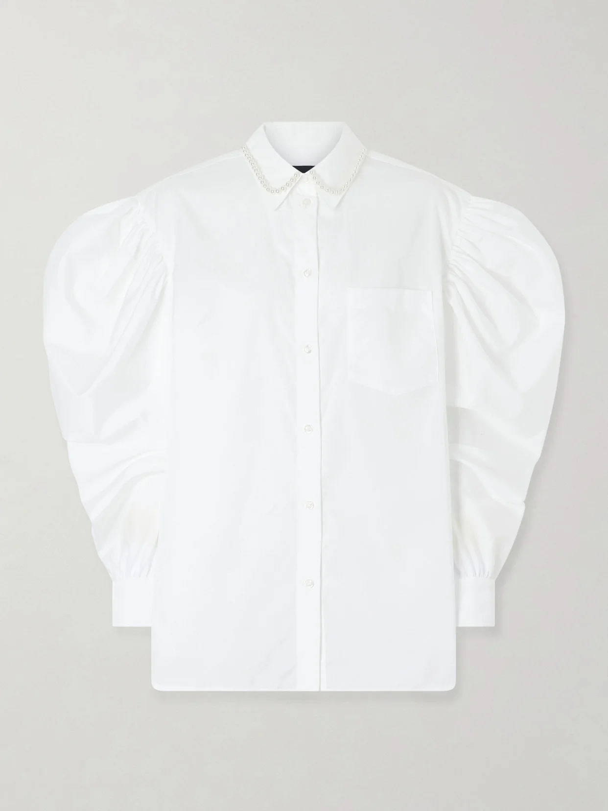 Simone Rocha's shirt subverts typical business styles with gathered princess sleeves. It's tailored from cotton-poplin and is artfully hand-embellished with faux pearls tracing the collar. Style yours with denim or tailoring.