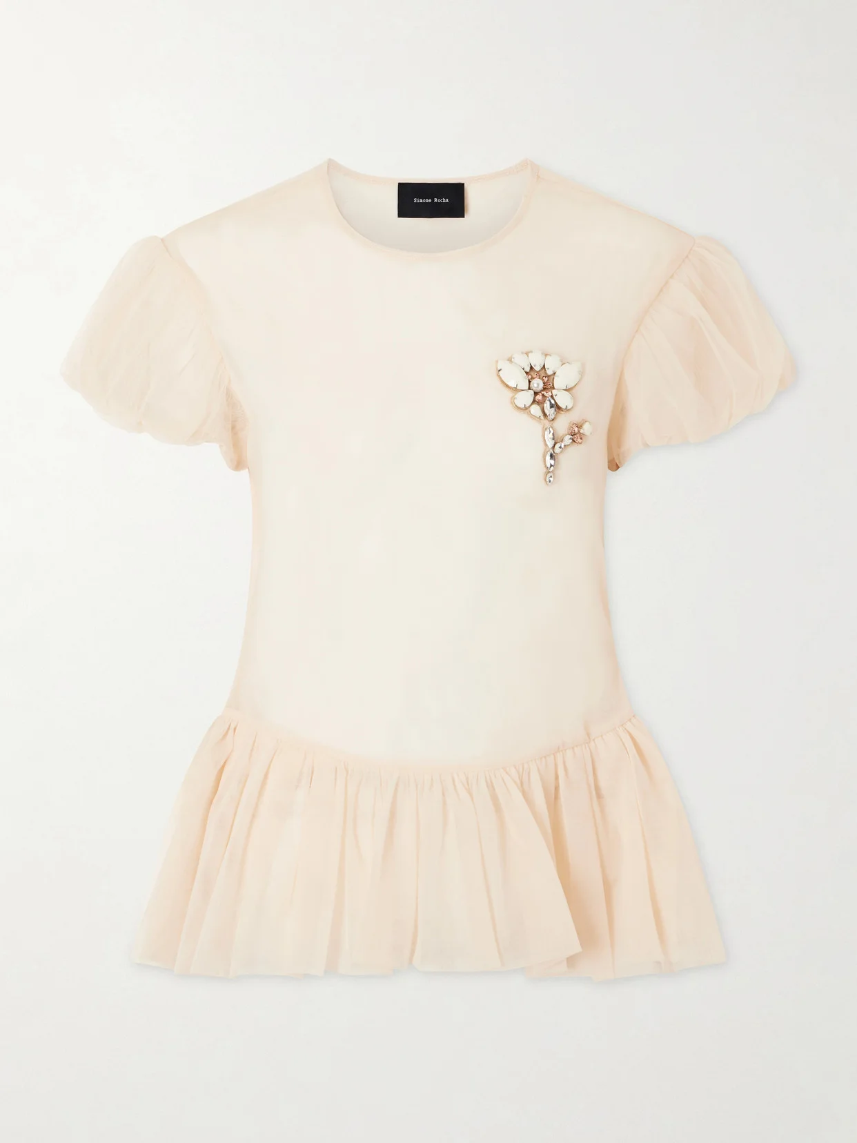 Simone Rocha's sheer ballet peplum top layers delicate transparency with sculptural detail. Cut with softly puffed sleeves and a flared hem, it nods to the house's romantic codes while retaining structure.