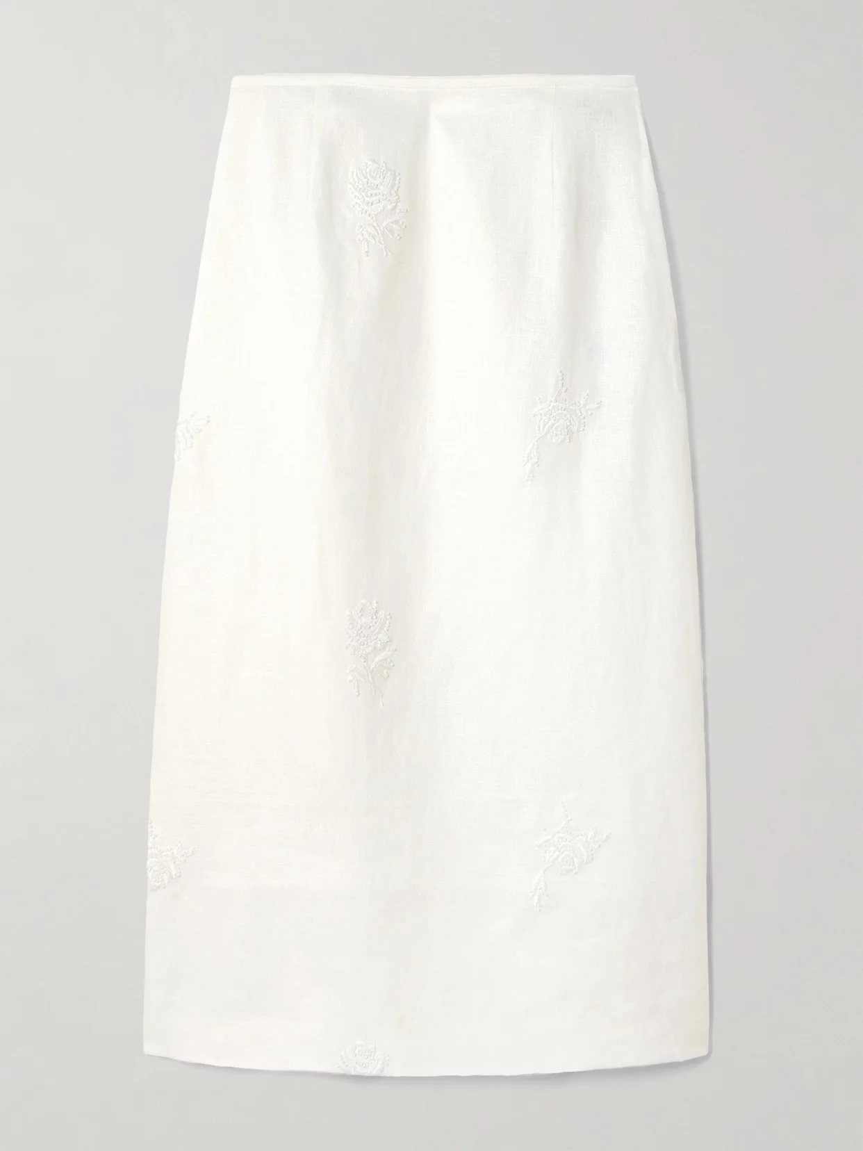 Paired with the matching top, SIR's 'Alessandra' skirt is perfect for soaking up the sunshine. It's cut from linen to sit high on the waist and has slits at the side for ease of movement. The beaded and embroidered florals are so elegant in their simplicity.